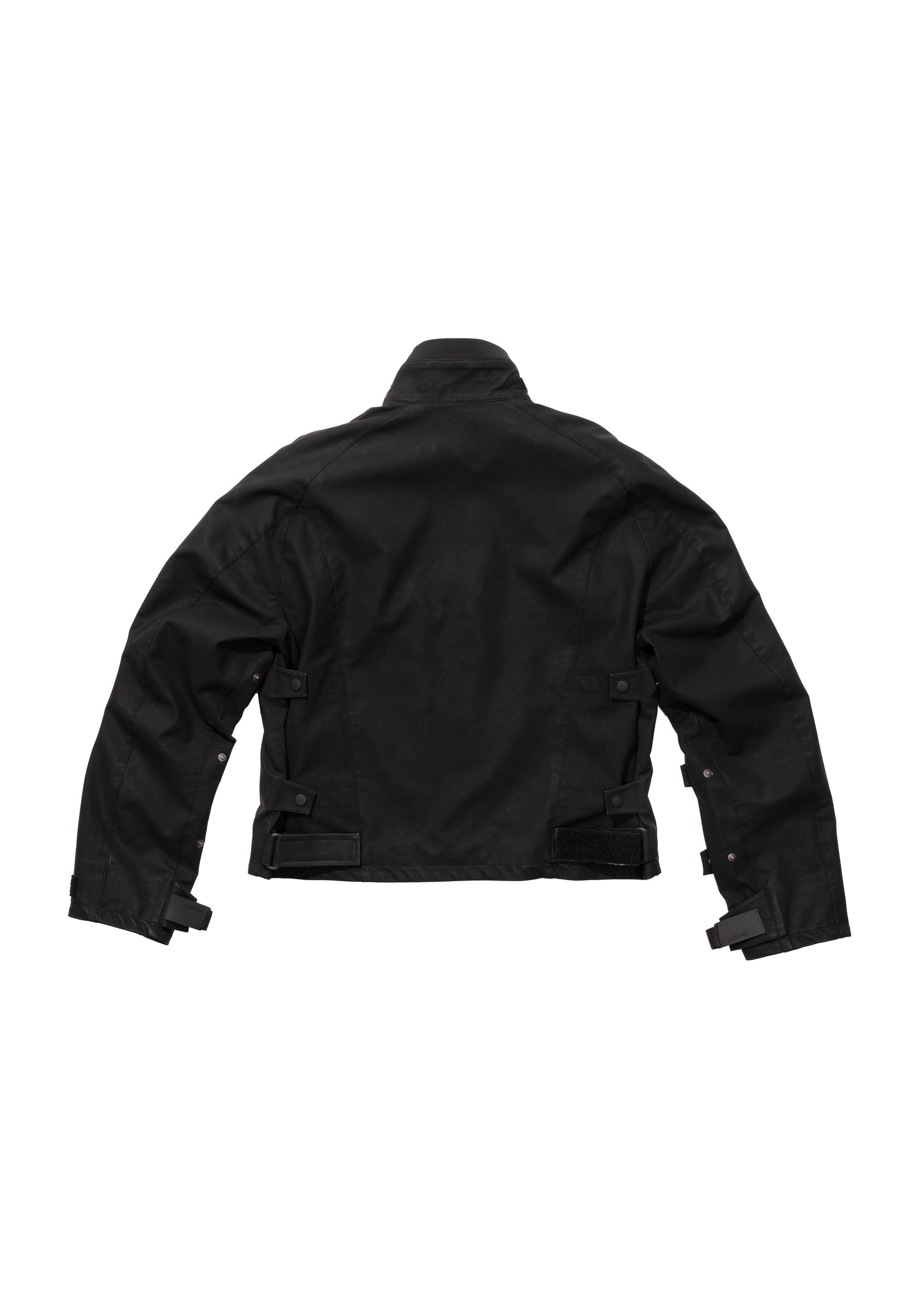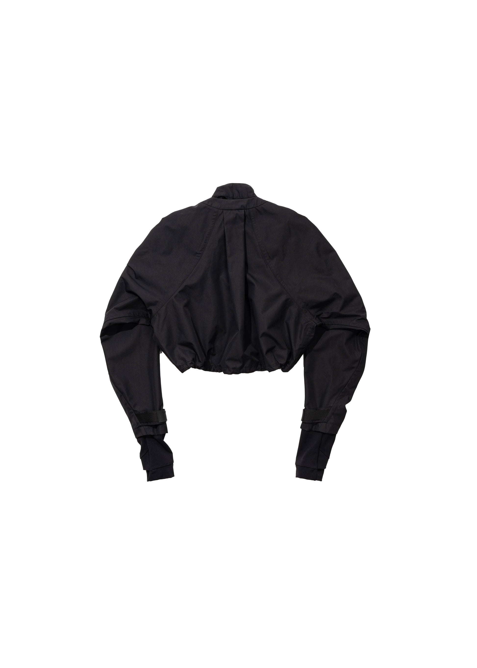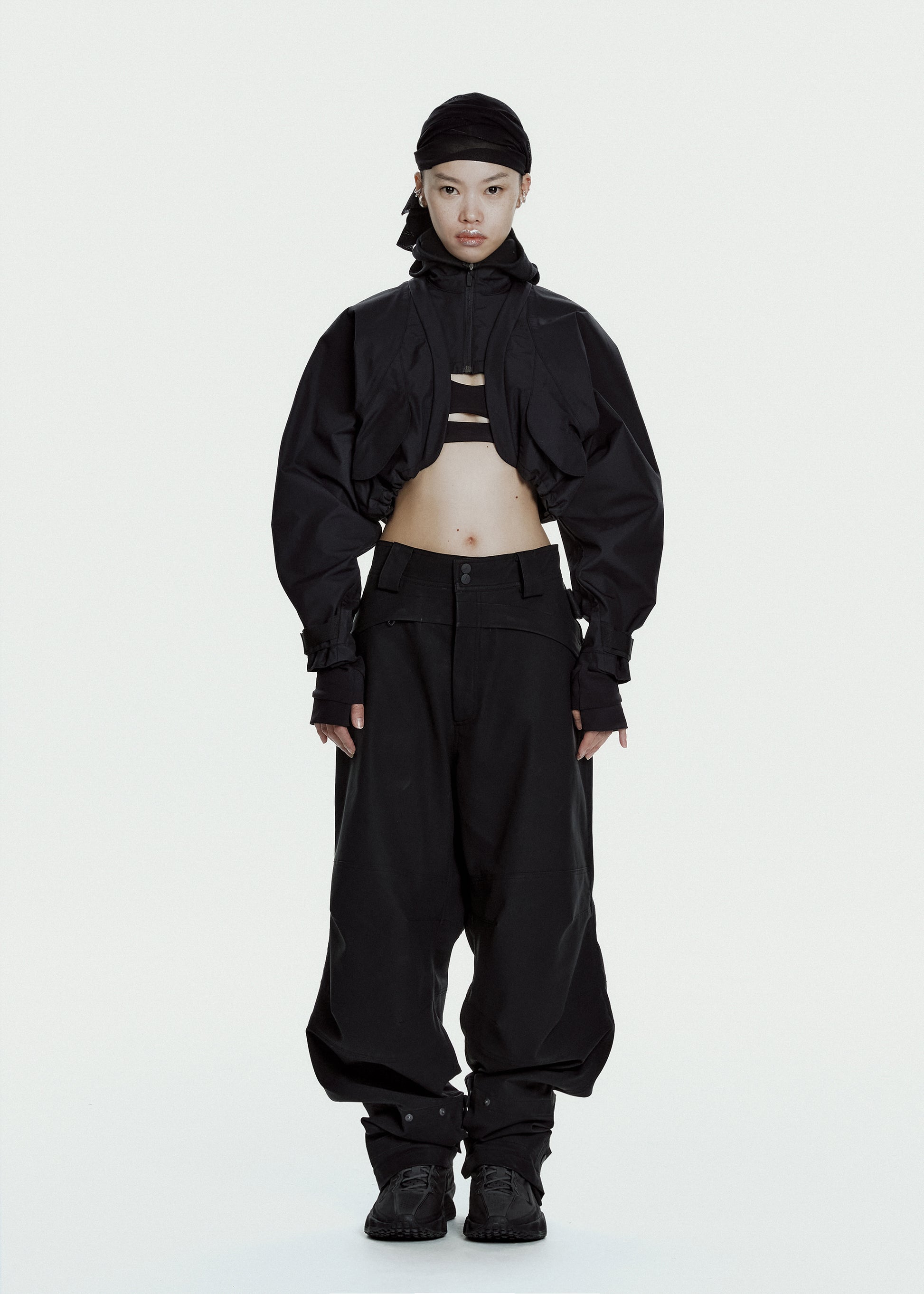 Adjustable snap at the hem, hidden zip pocket details throughout, detachable bag detail.