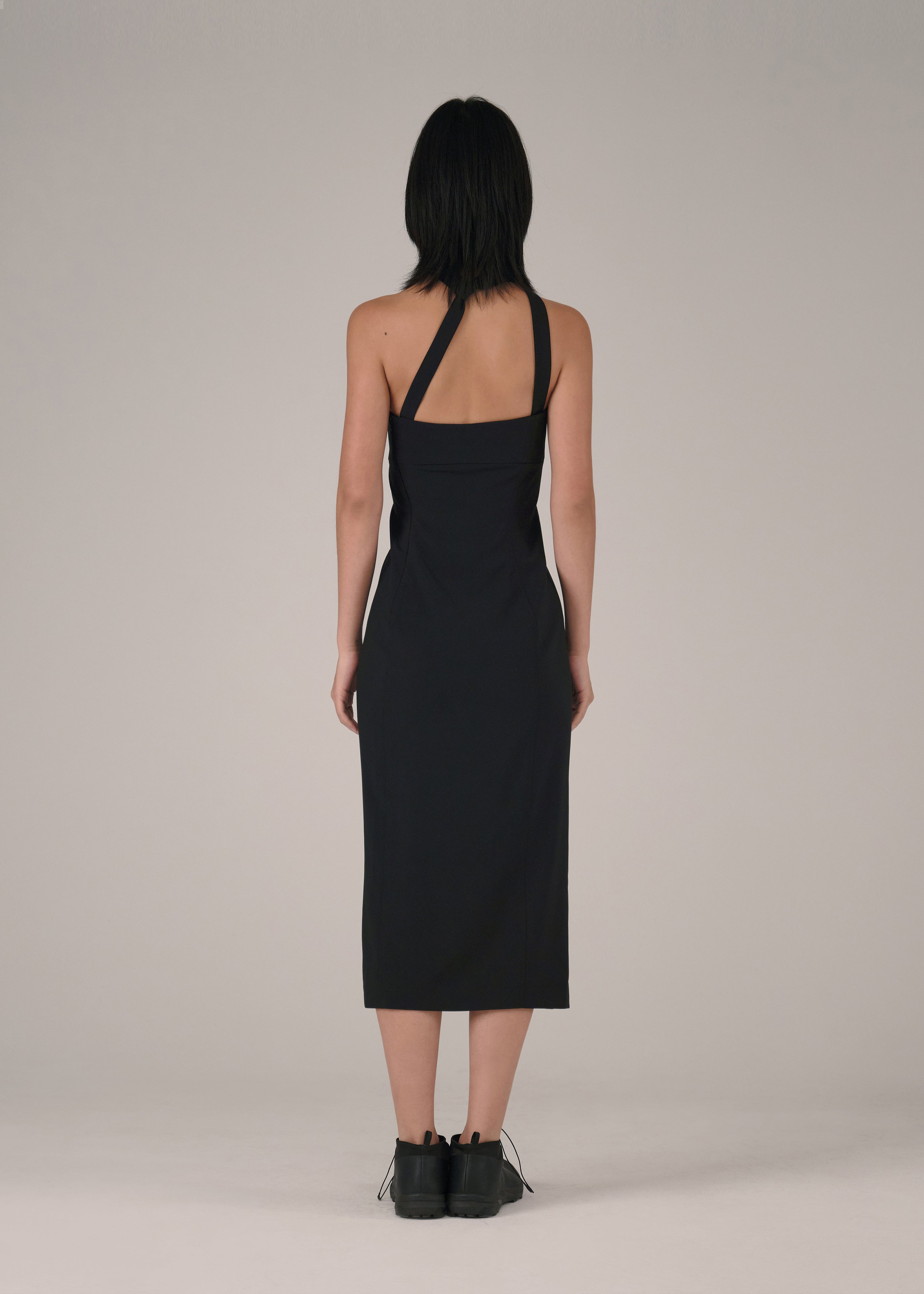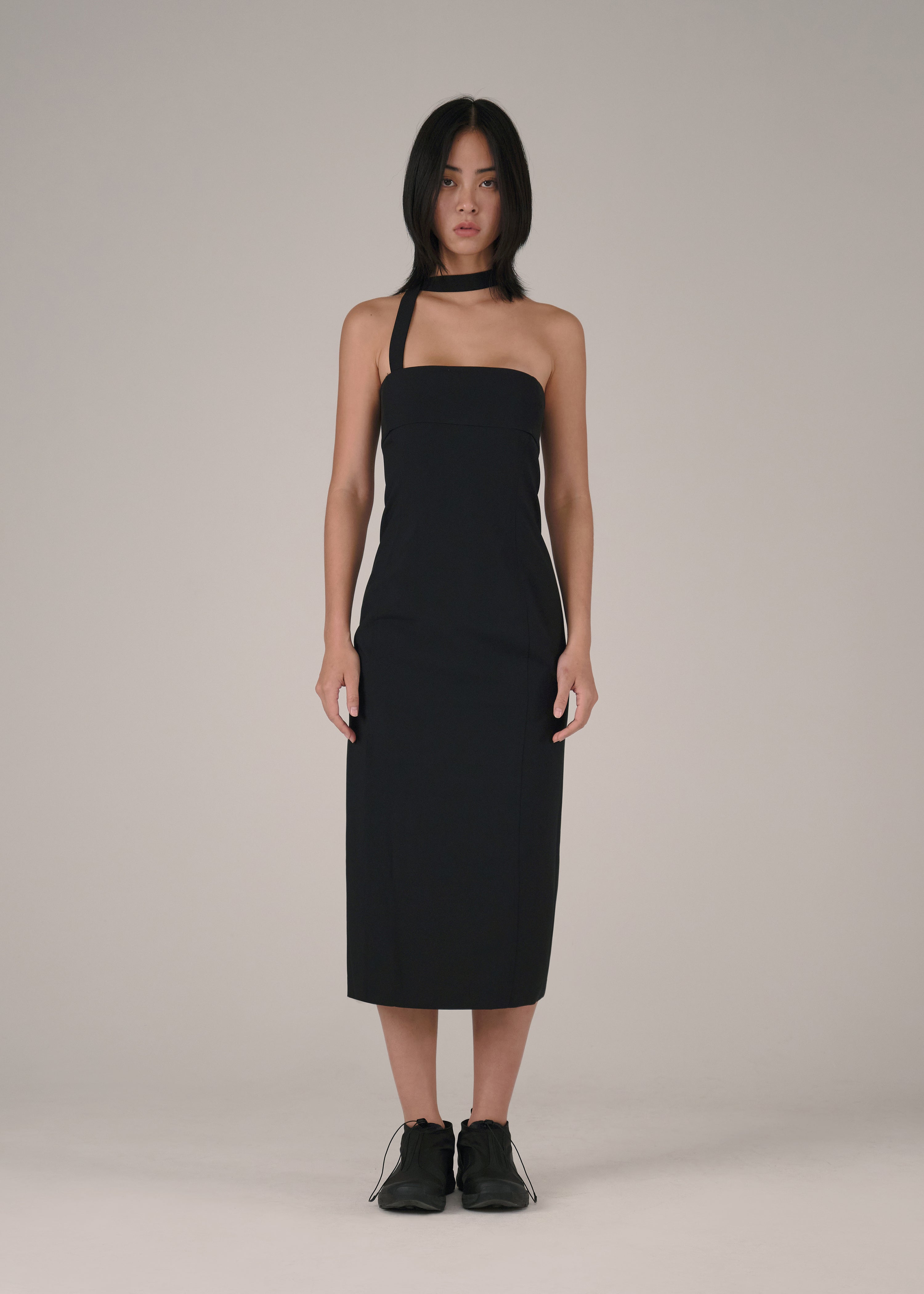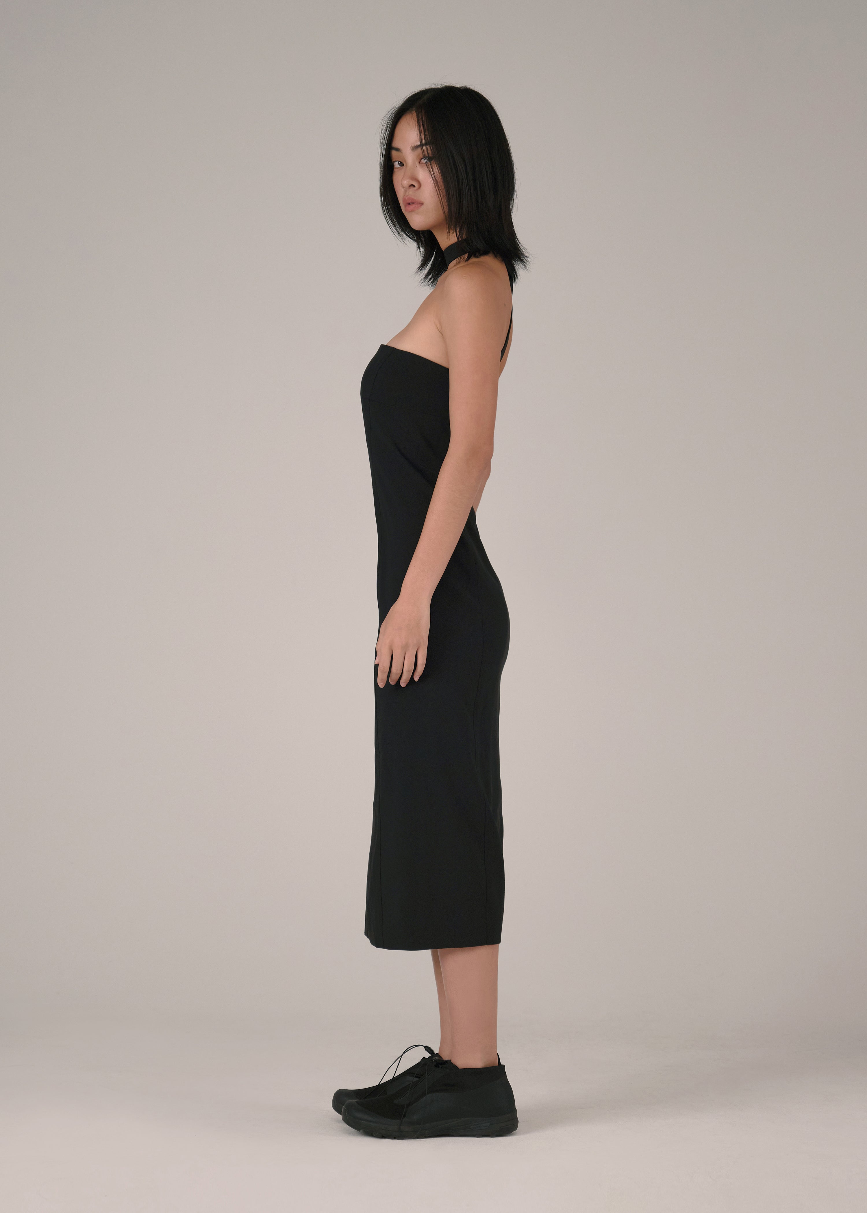 Long dress with taped seams, adjustable straps, slit at front and hidden zipper closure.