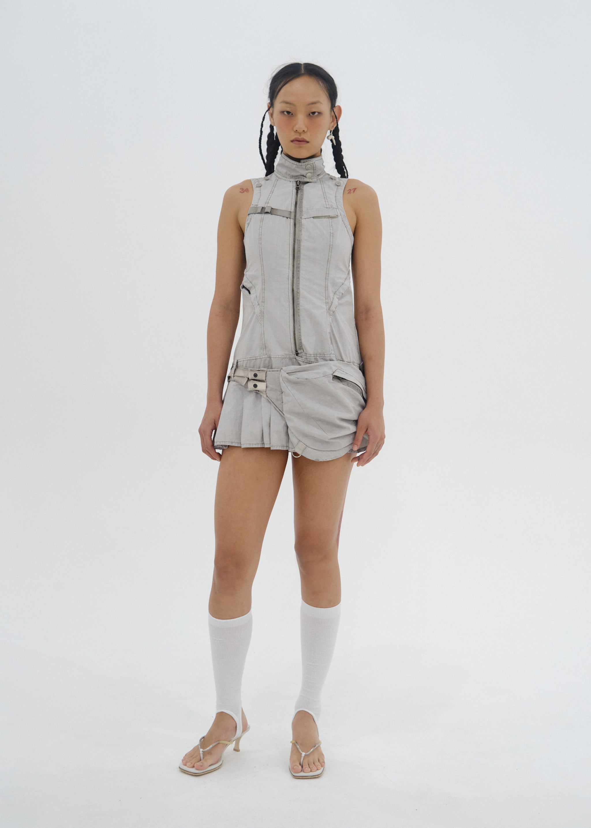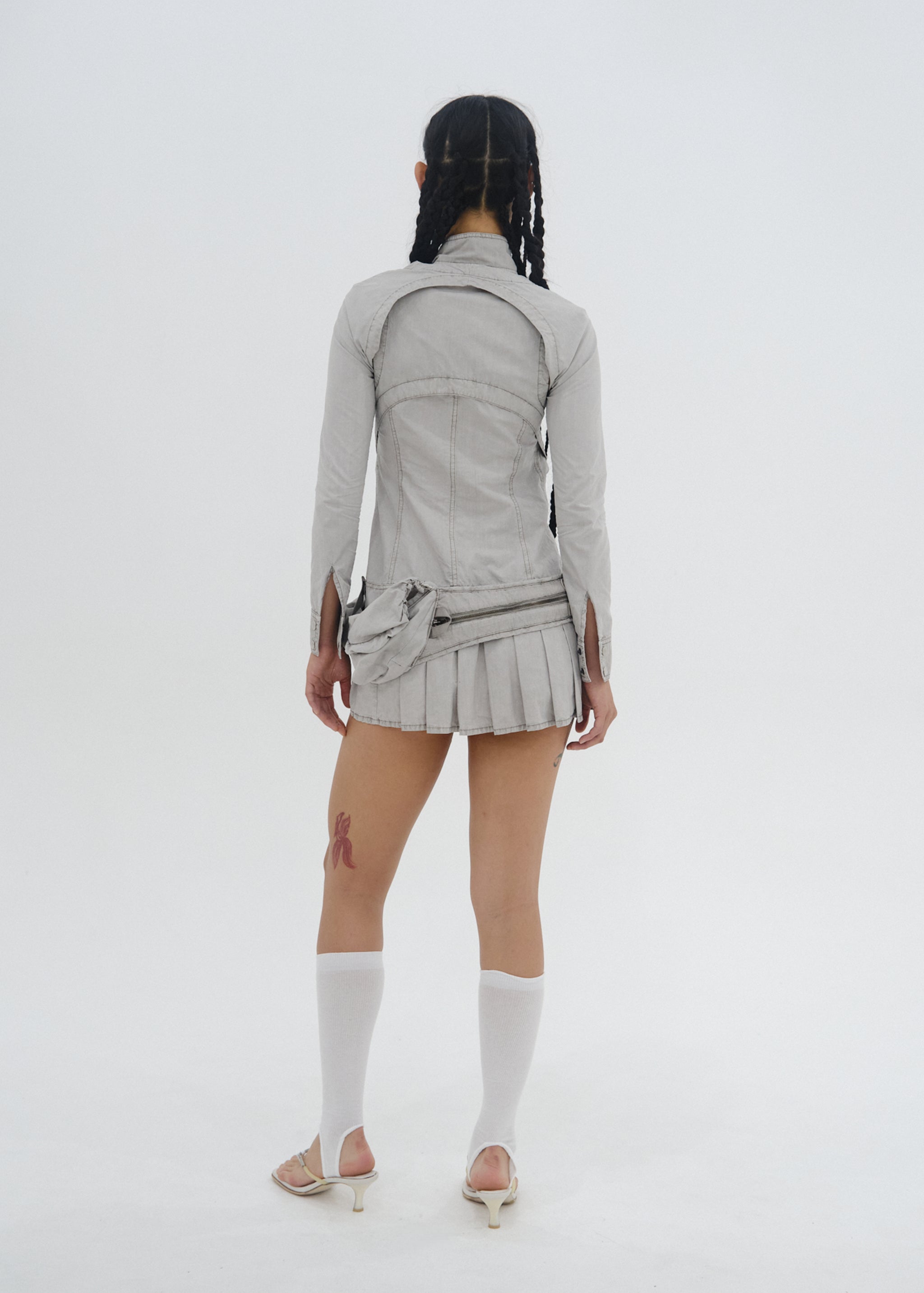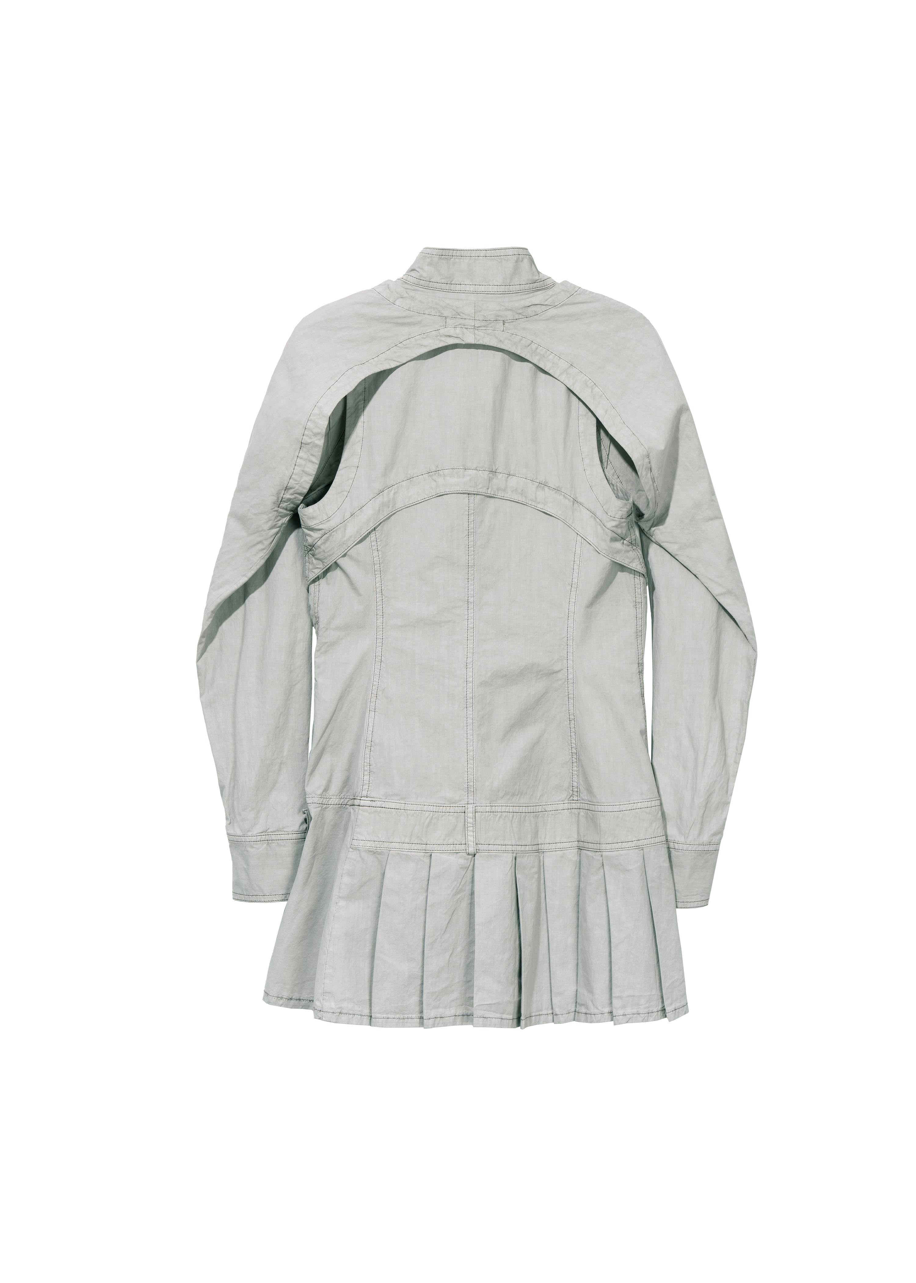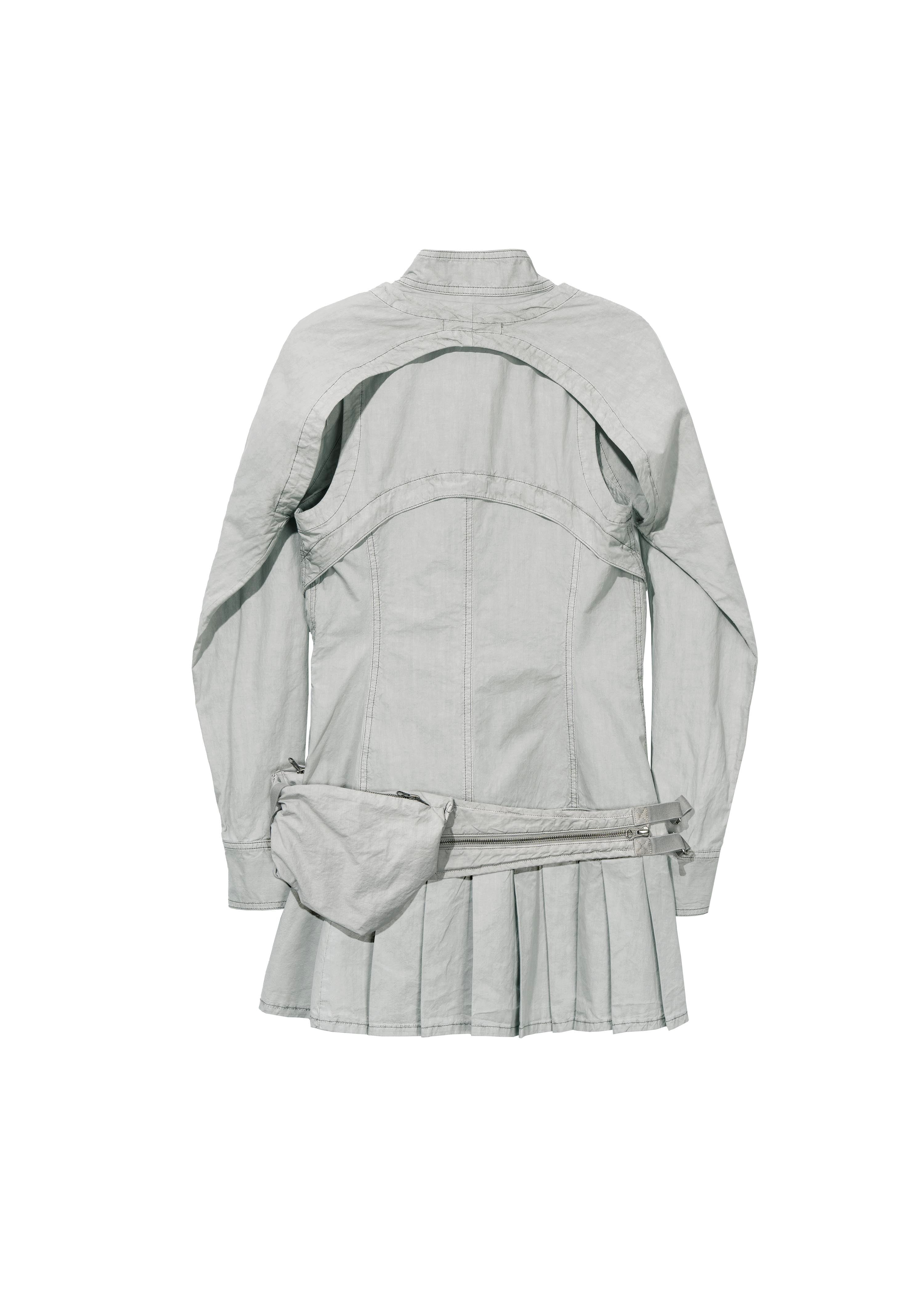 Transformable dress in pigment-dyed fabric, featuring a stand collar and detachable bolero sleeves secured by buttons. The skirt has a pleated design, while the bag can be wrapped around the waist or worn separately. A rubber logo label is placed on the chest.