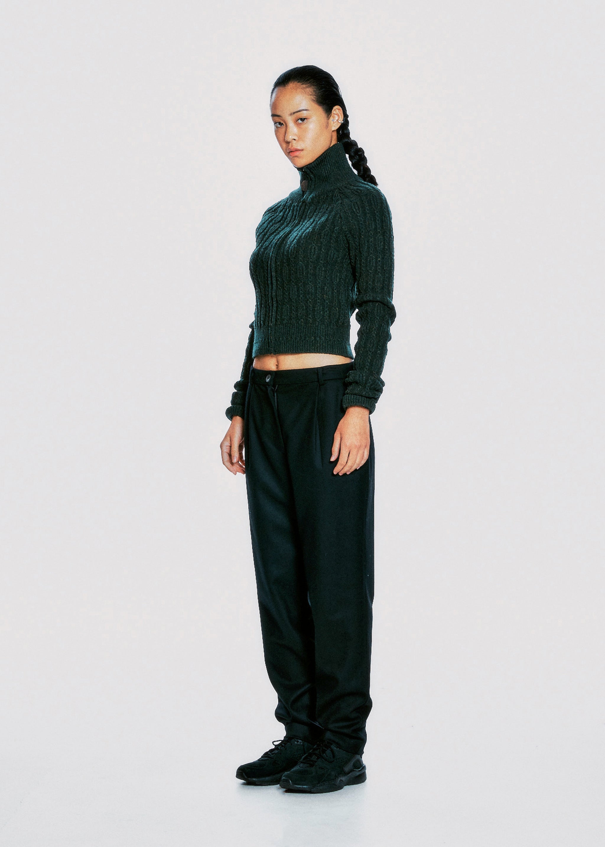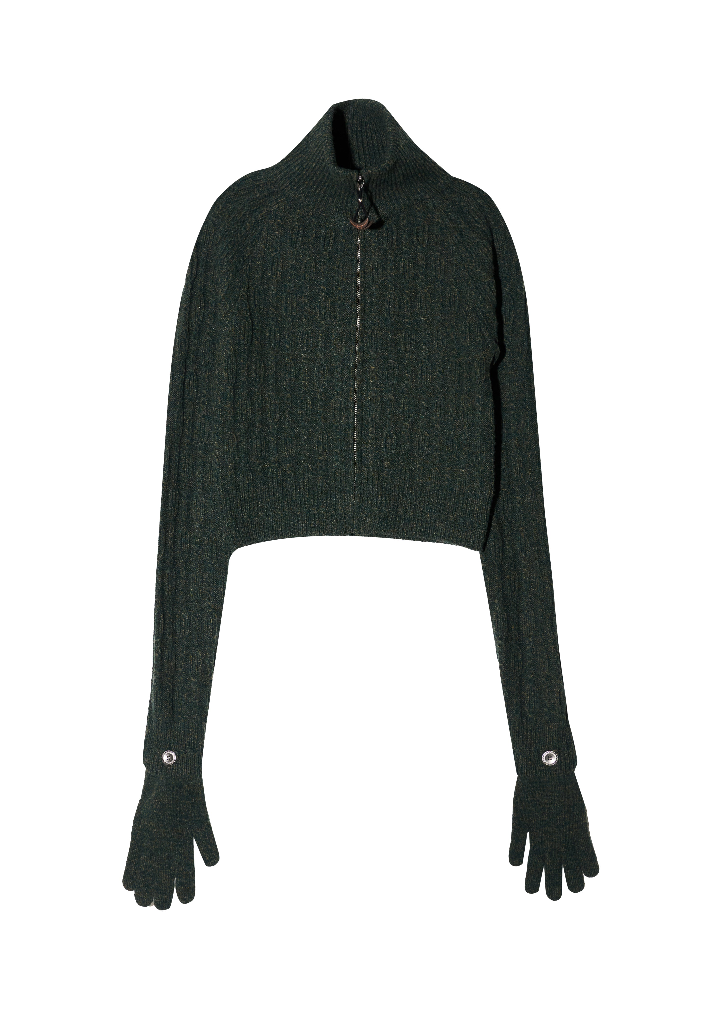 Full-zip closure with ceramic hardware puller, detachable gloves