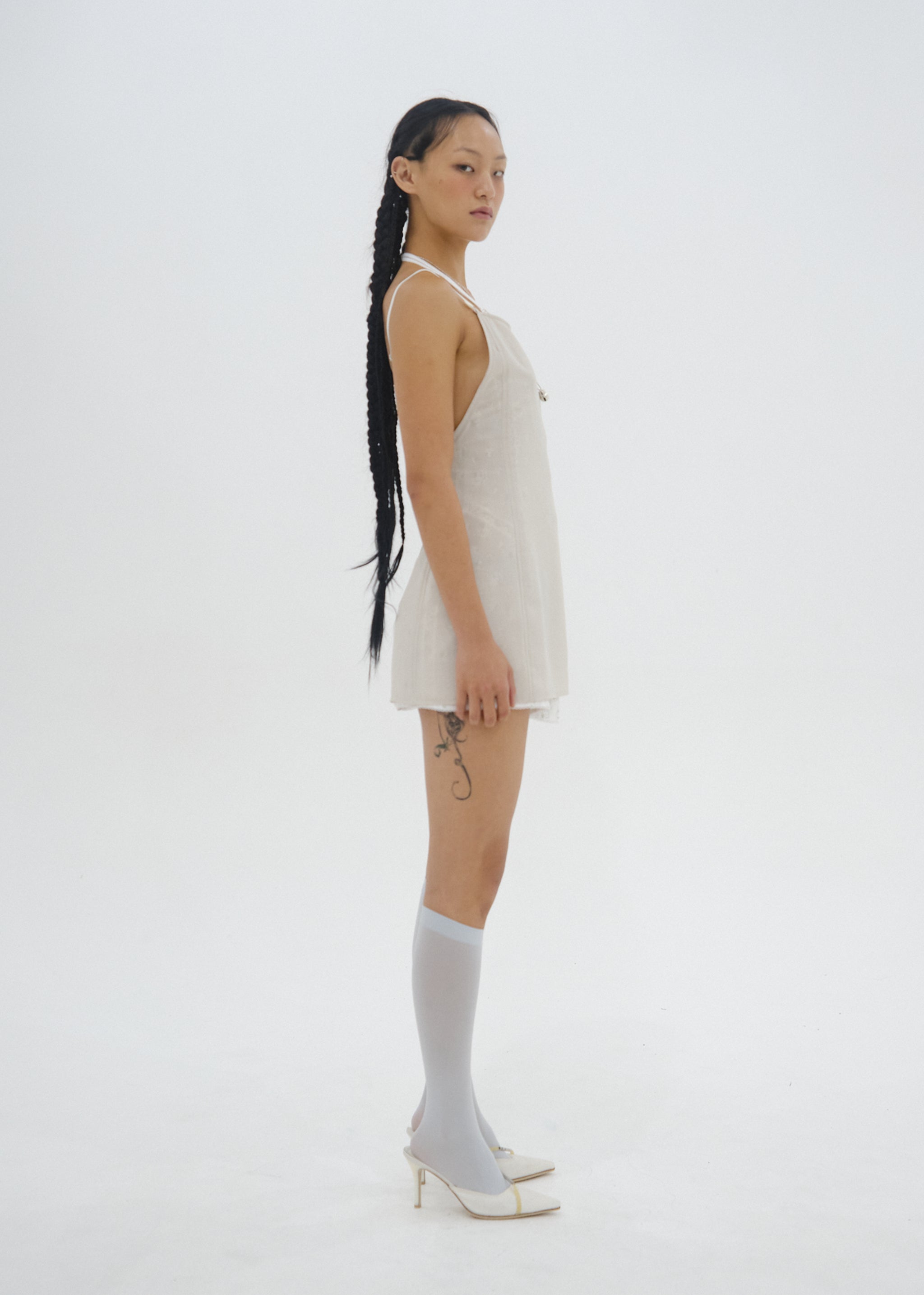 Layered dress featuring two separate slips. The outer slip is detailed with a rubber label and lace trimming along the side seams, while the inner slip showcases a floral print and button-up front. Adjustable elastic shoulder straps offer a customizable fit. The slips can be styled individually or layered together.