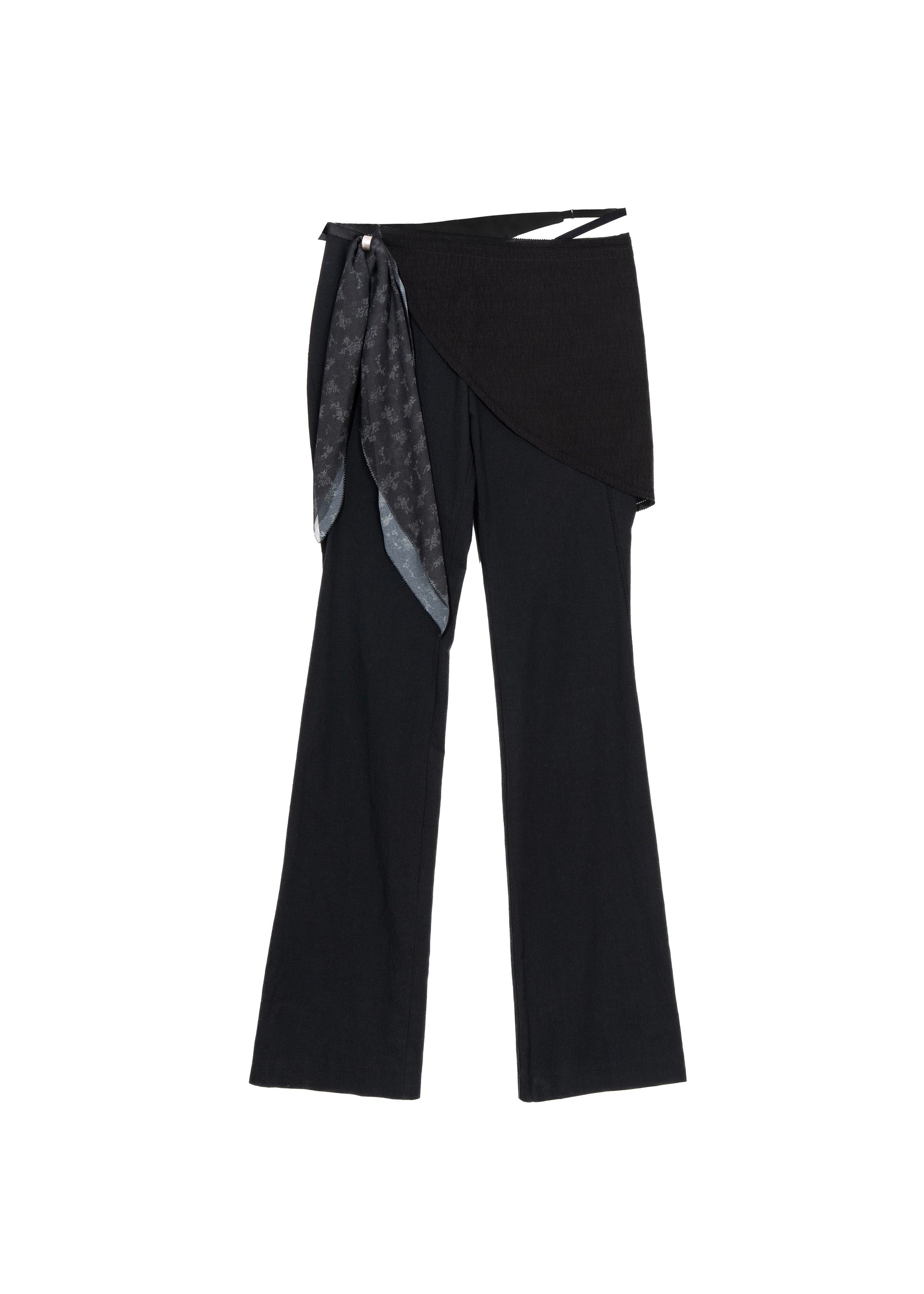 Double-layer t-shirt featuring a diagonal cut along the hem. The upper layer has a silkscreen-printed graphic, while the under layer includes a side label sewn along the side seam. The trimmings hanging from the side label are detachable. One side seam on both layers can be opened using buttons.