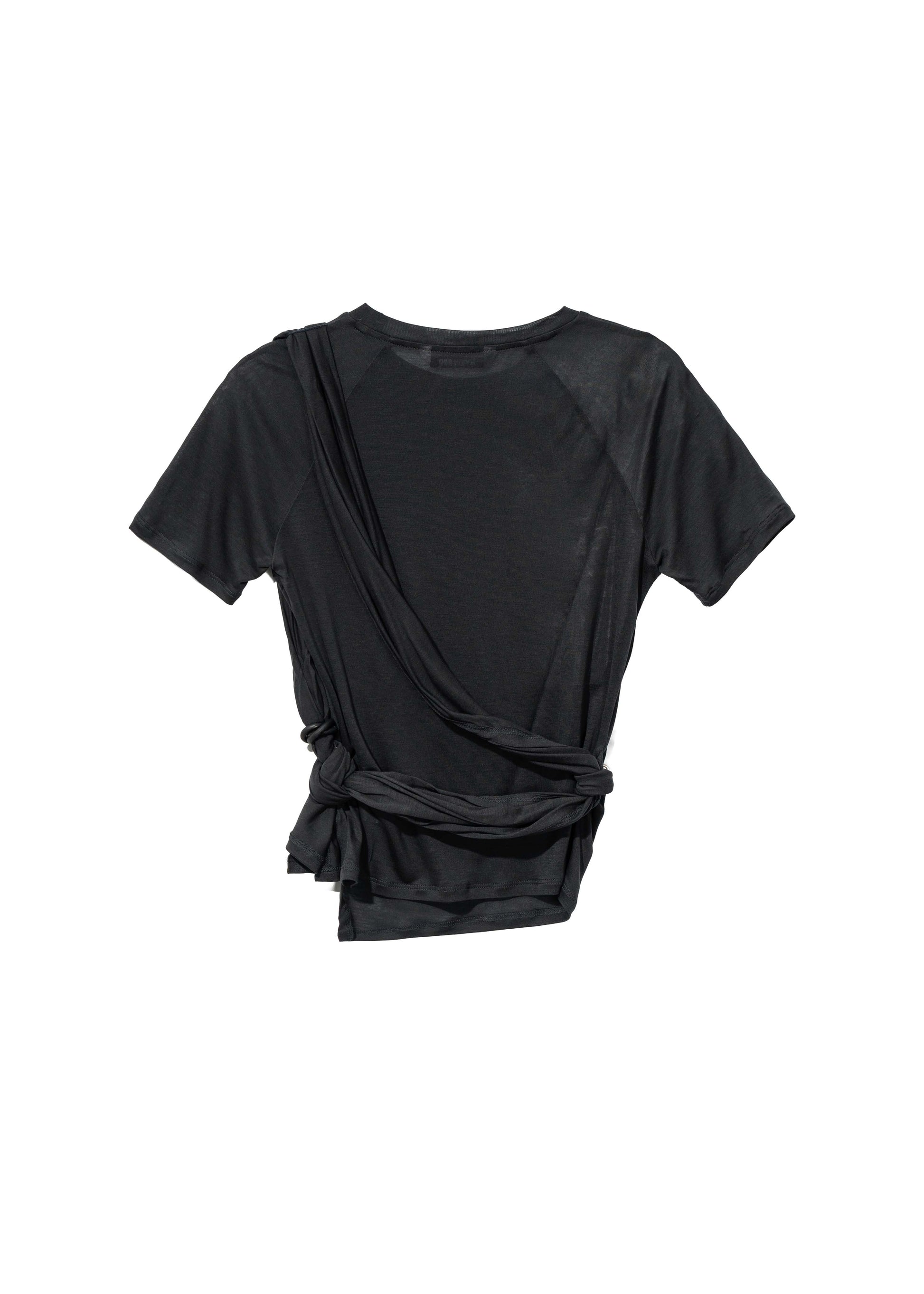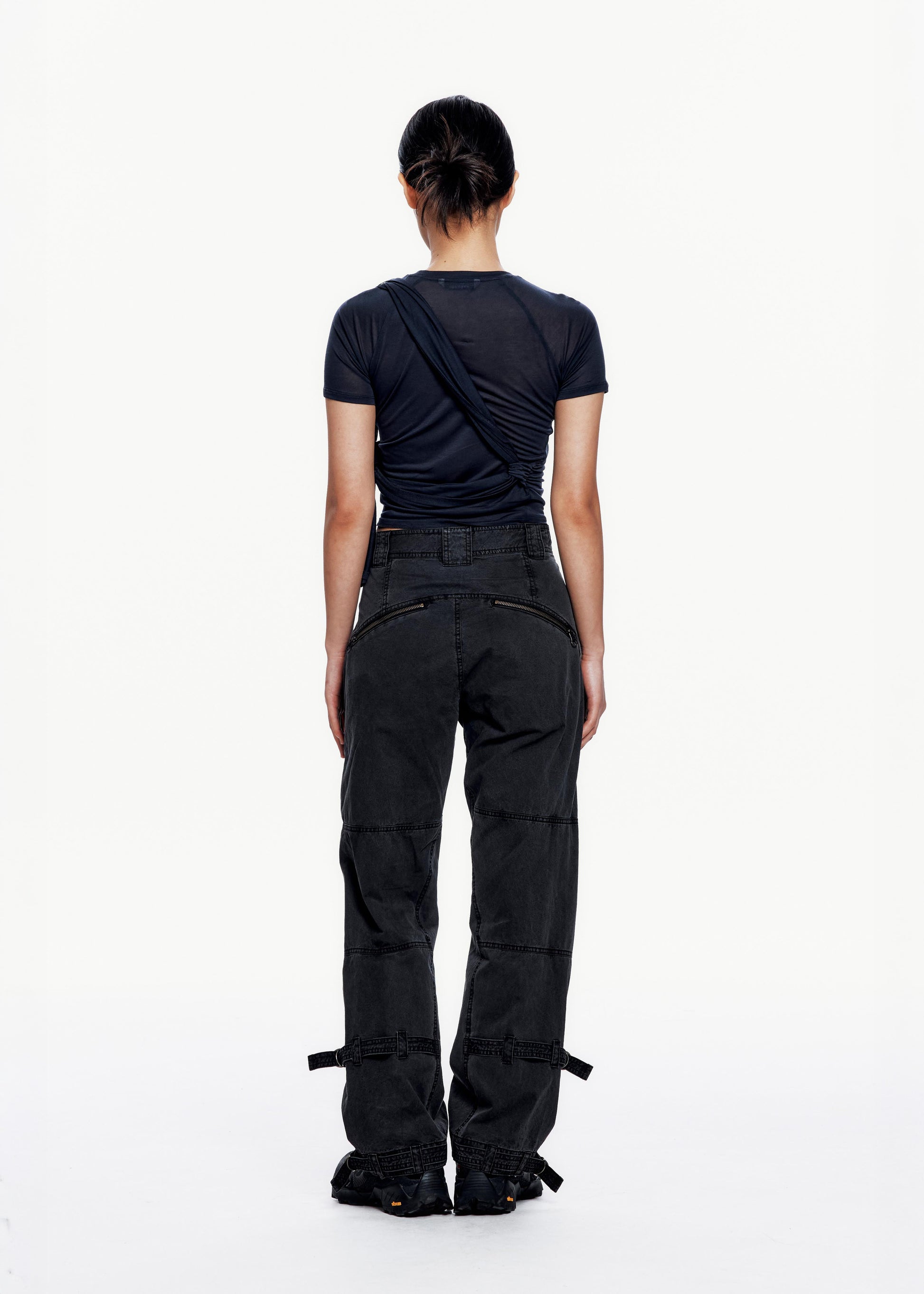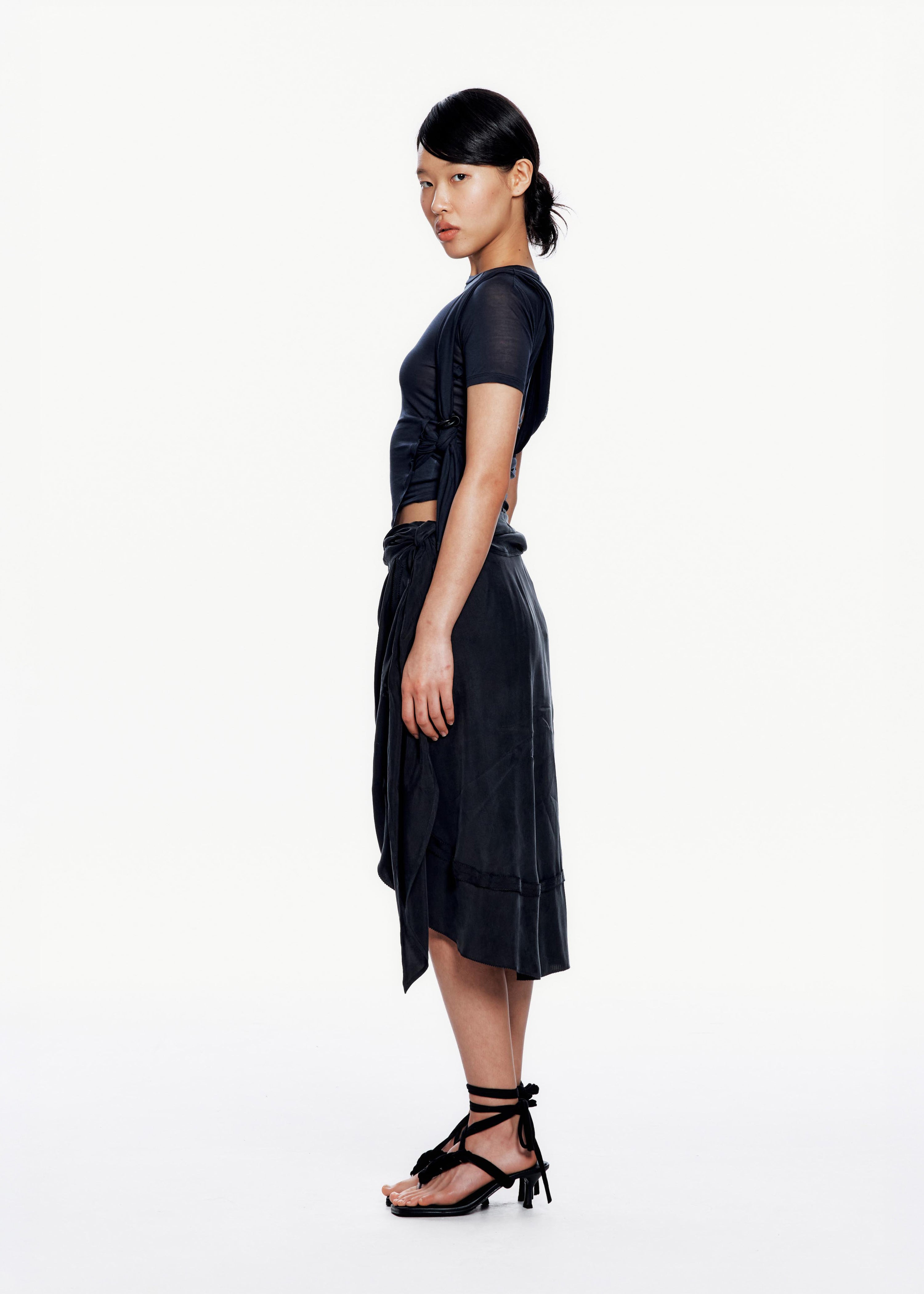 Half-circle skirt folded in half to create a draped silhouette. Hemline finished with lockstitch. Gathered into straps that pass through two brass rings and wrap around the waist. Silkscreen graphic printed along the right front hem.