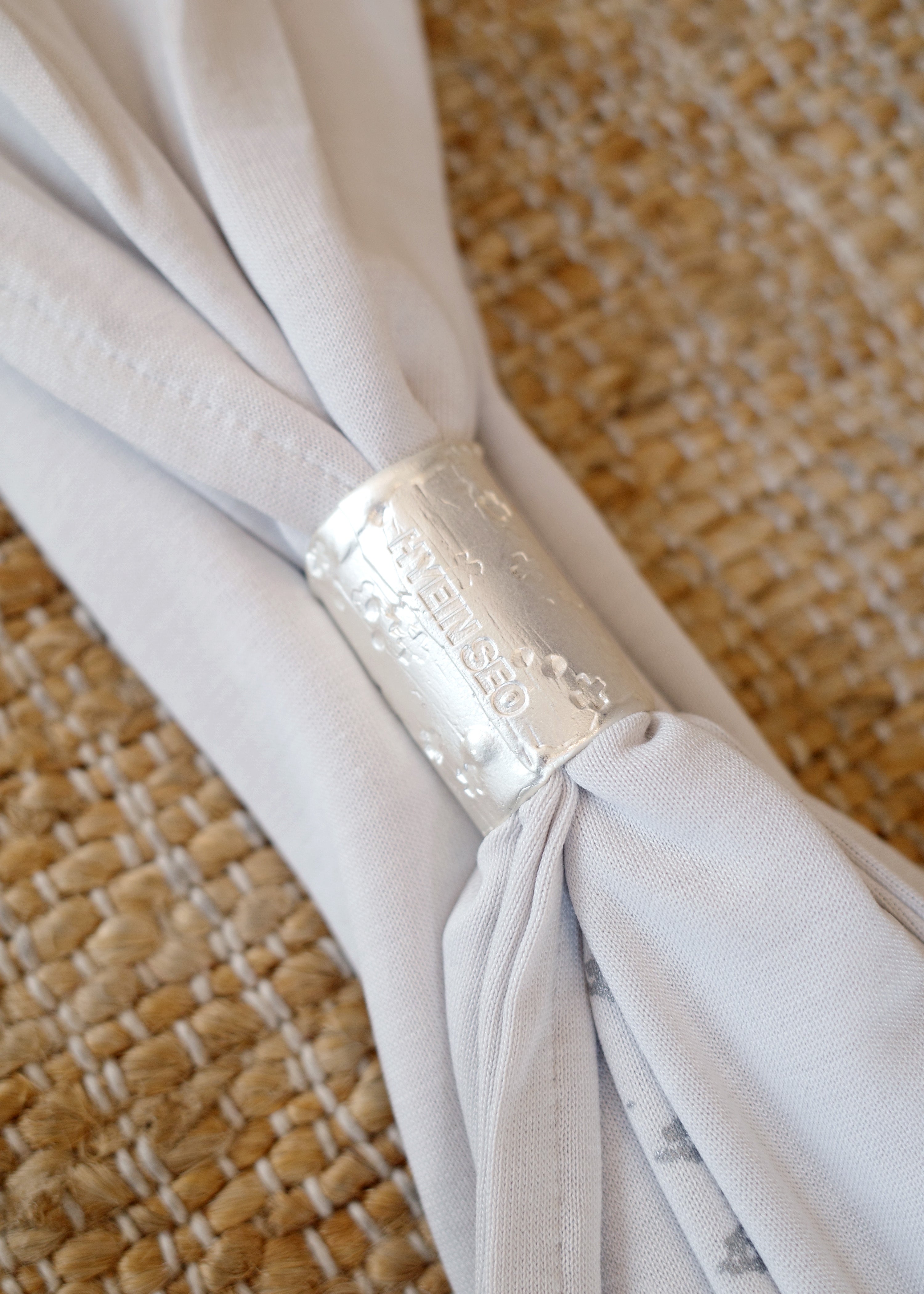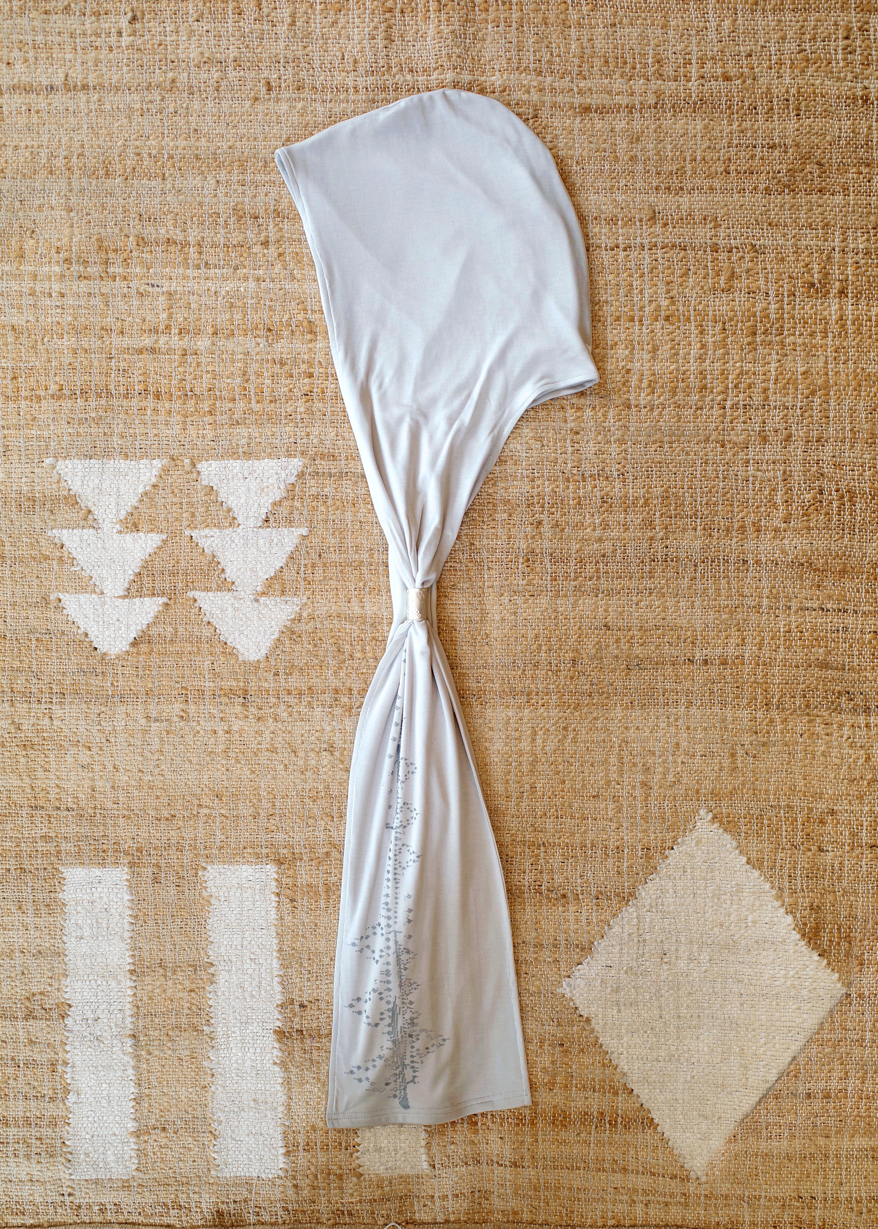 Scarf-style hood featuring a printed graphic, designed to pair easily with any outfit. A brass ring is threaded onto the strap extending from the hood, allowing it to be wrapped like a scarf.