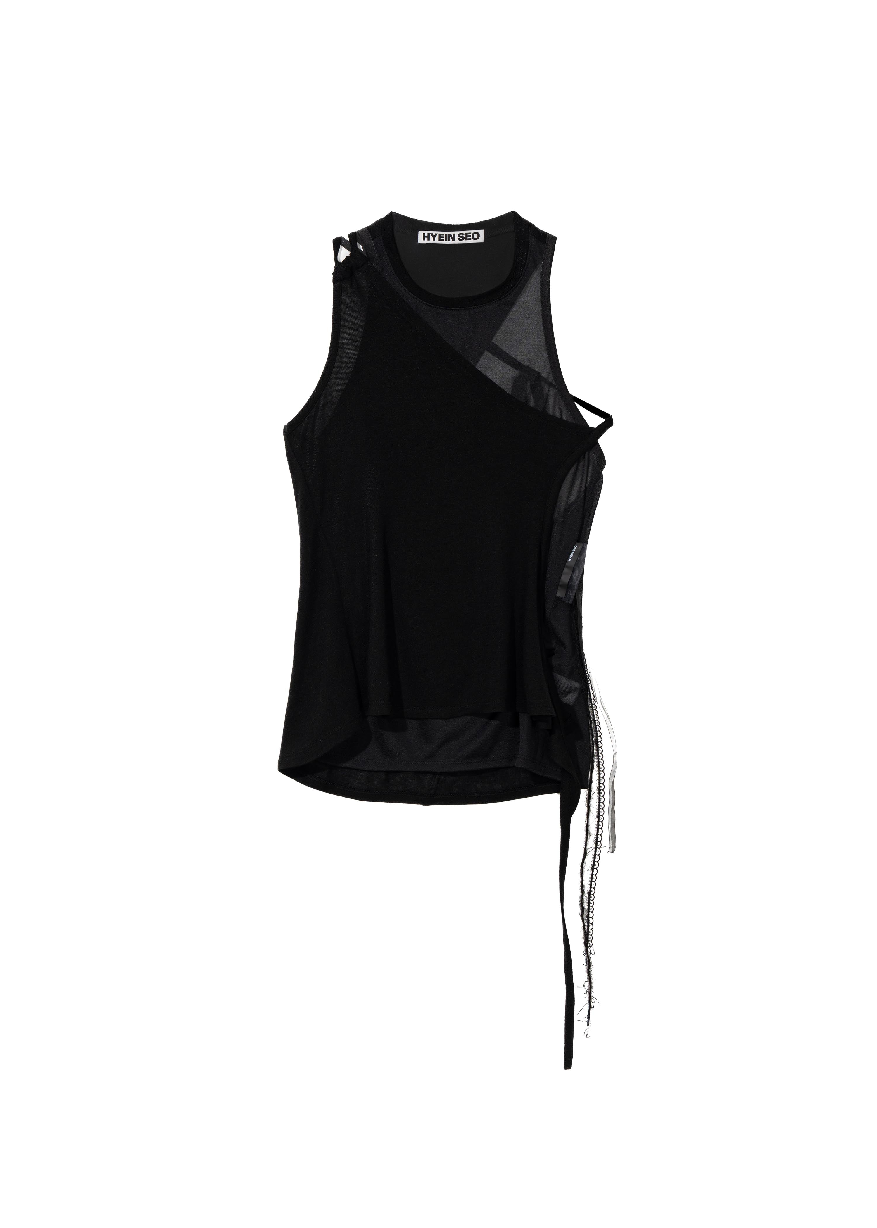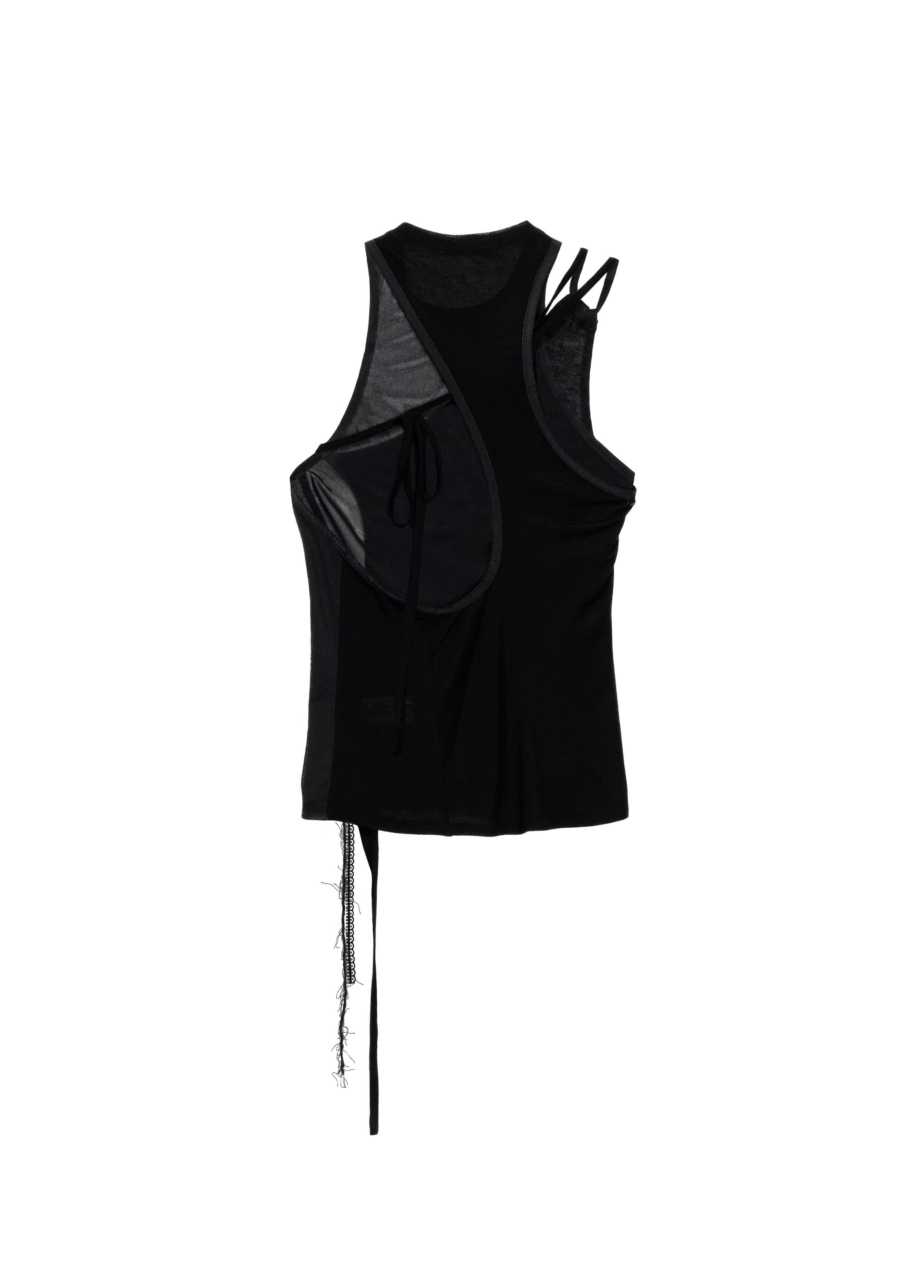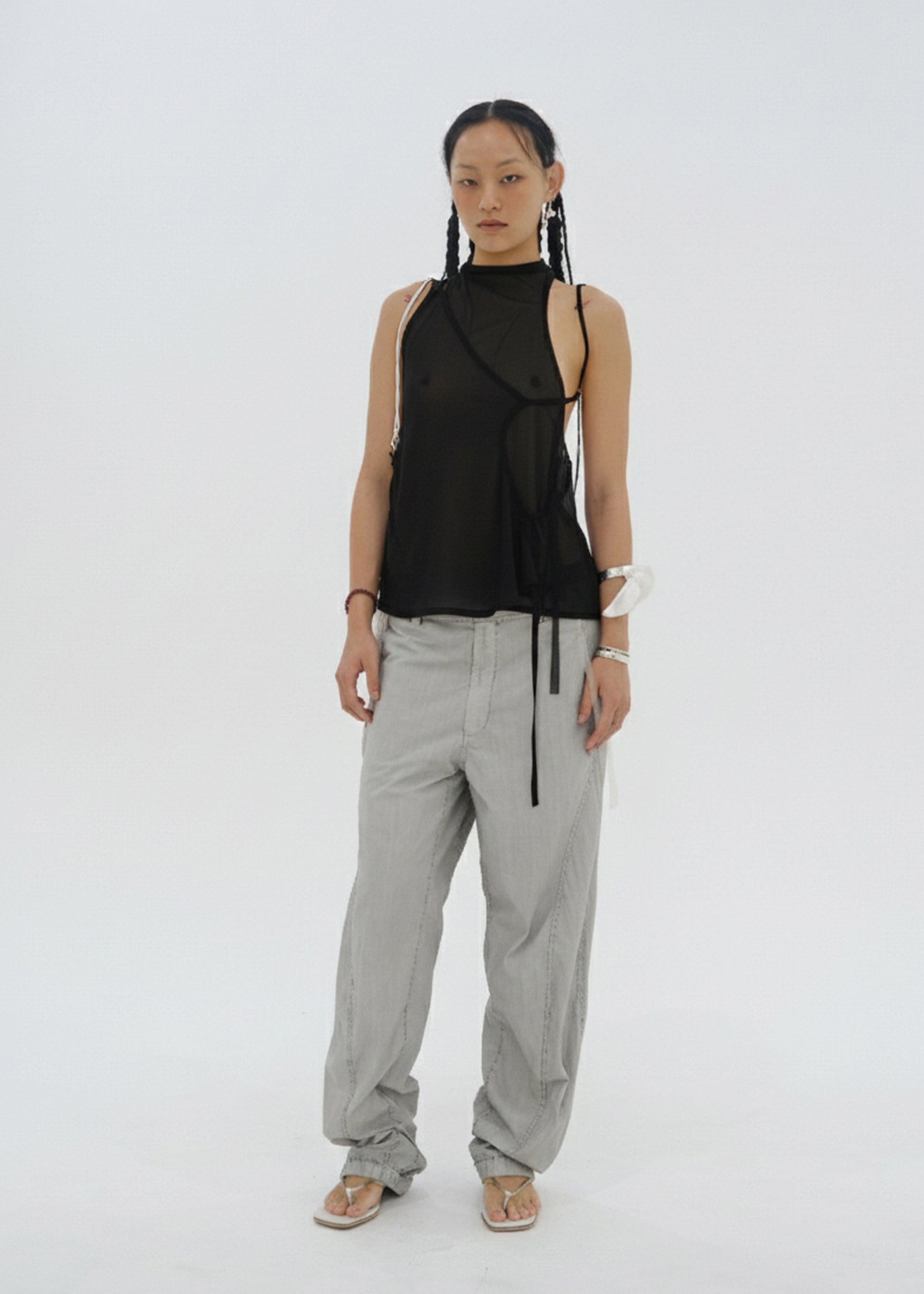 Layered drapery detail at the waist. Made from sheer jersey fabric. Rubber logo label with ribbon trimming along the side seam.