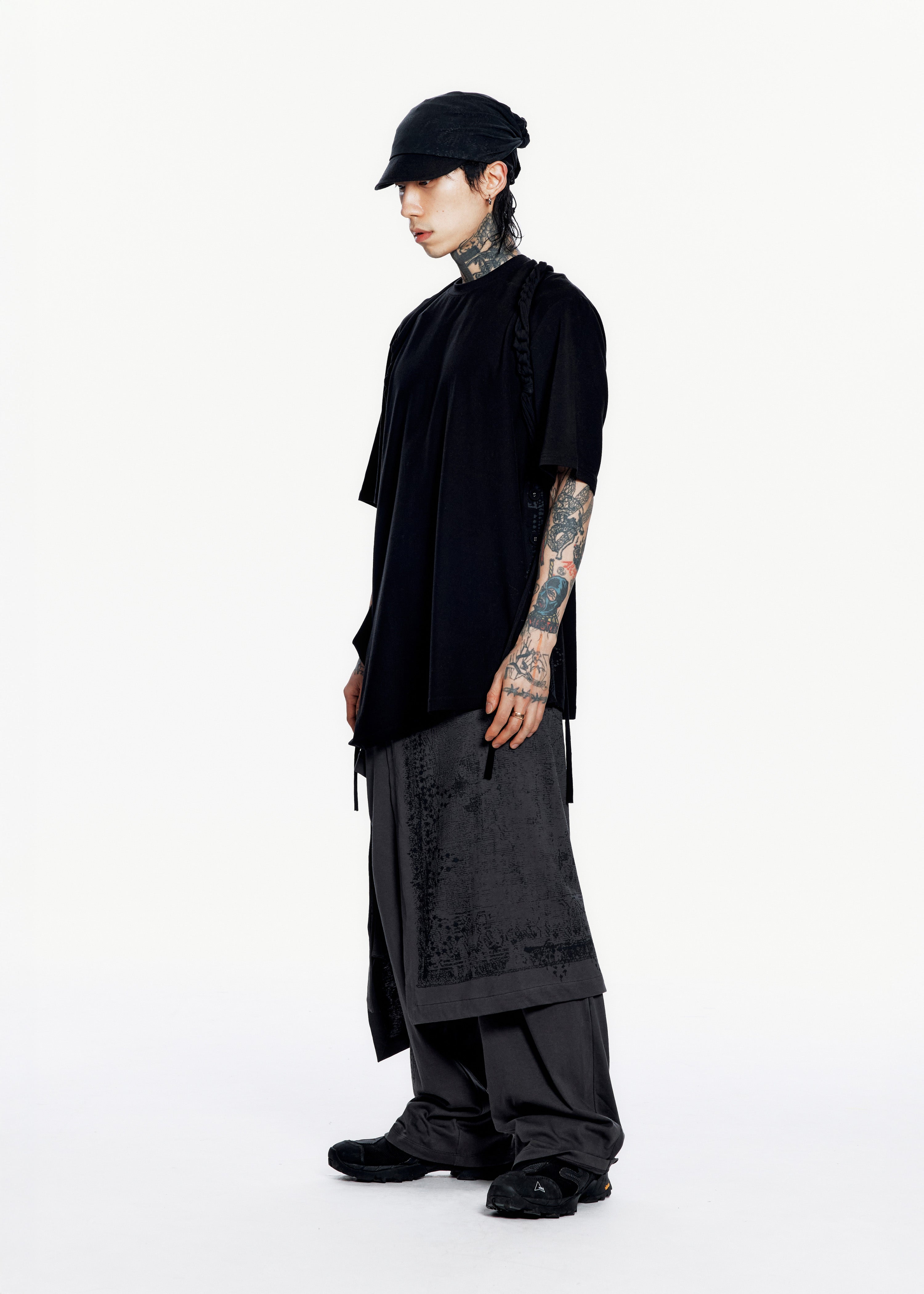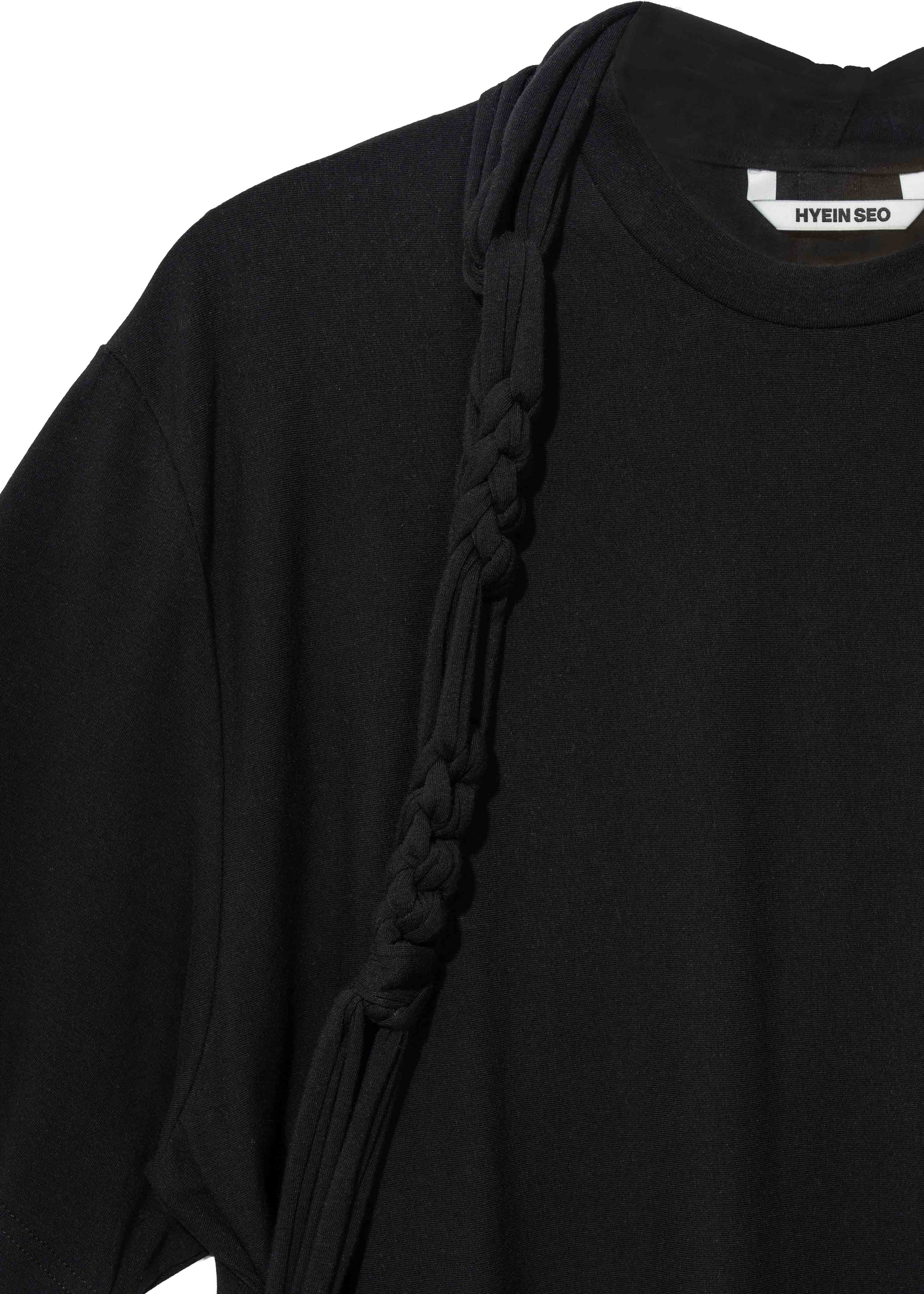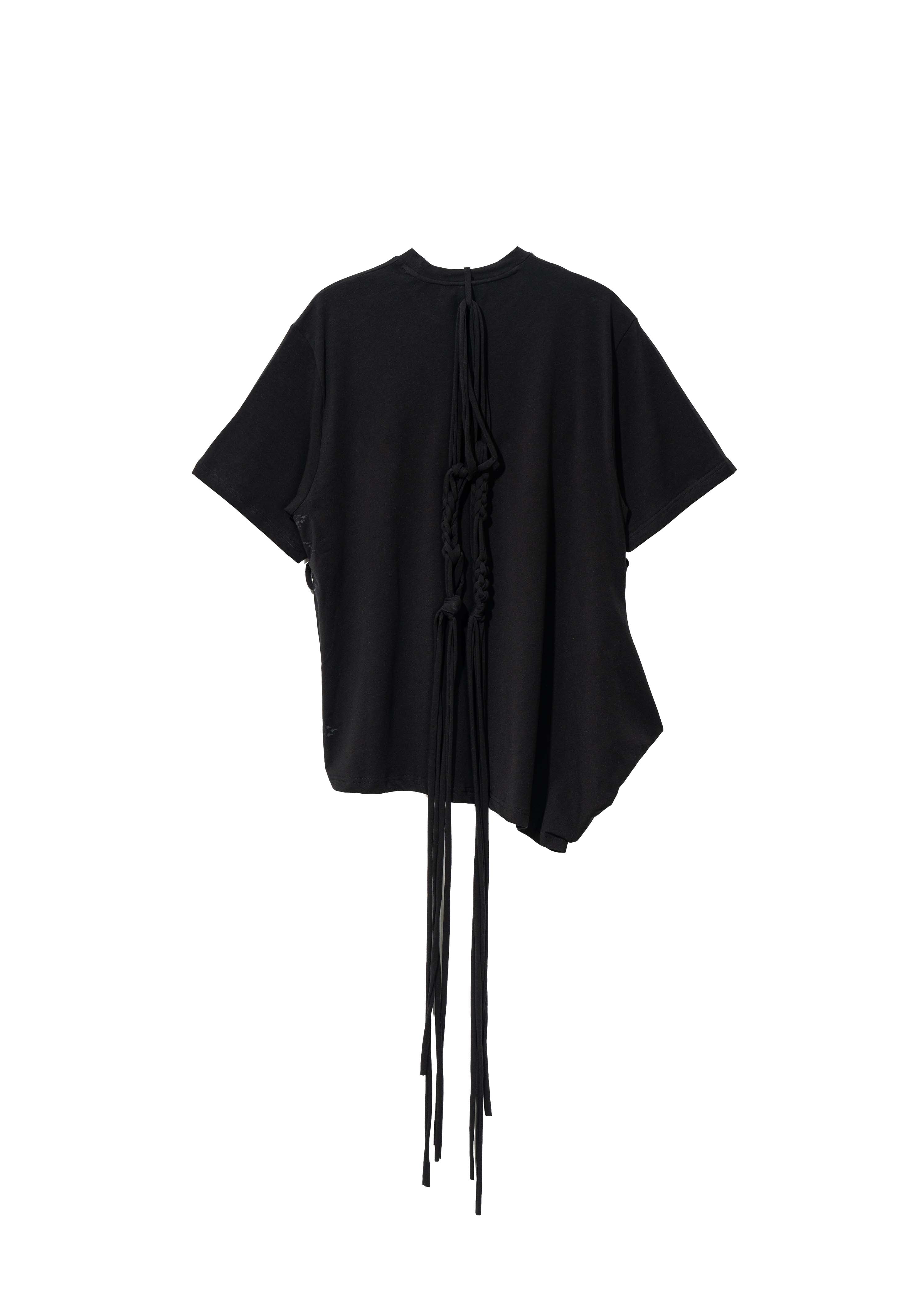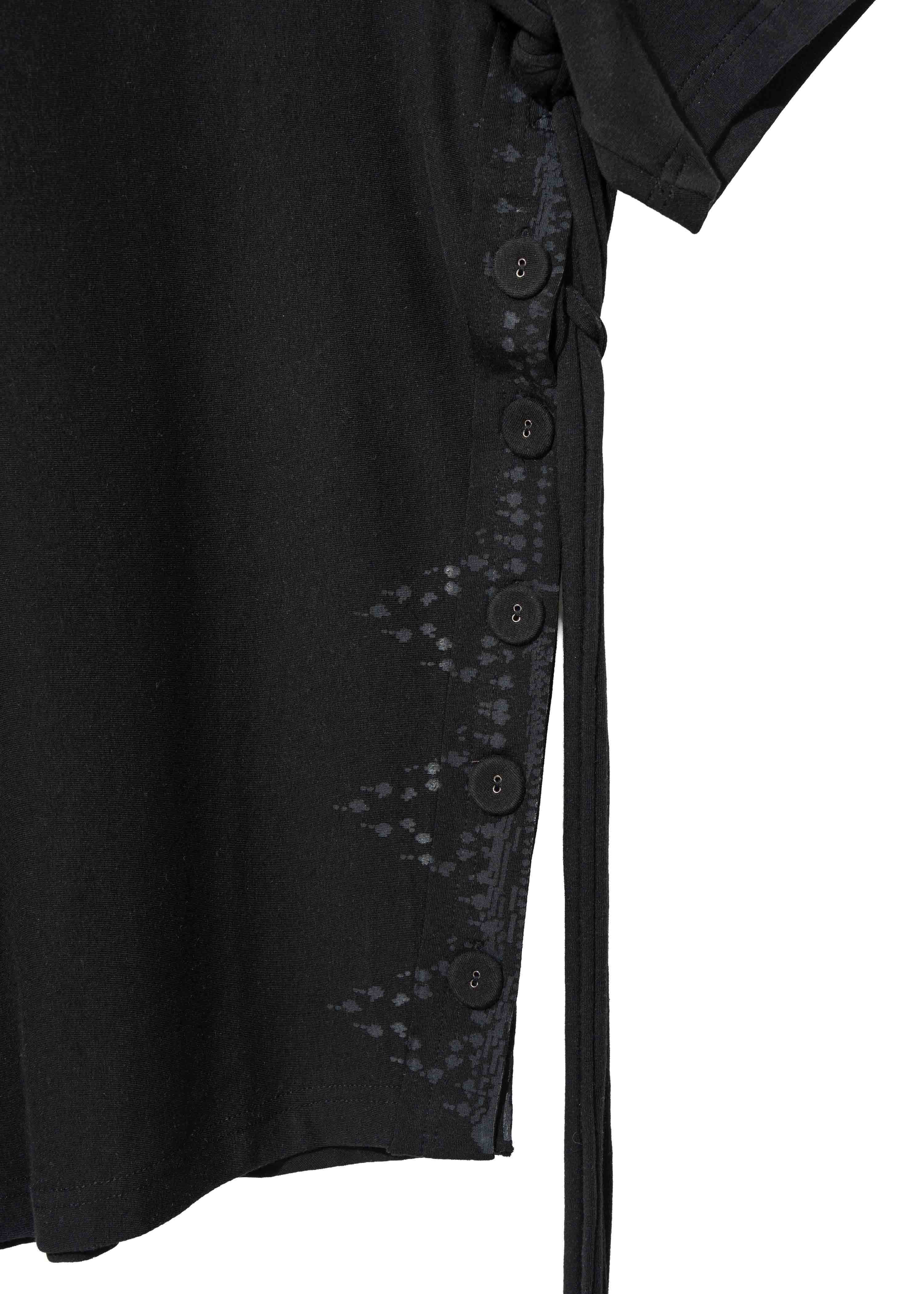 Top with a draped silhouette and a diagonal-cut hem. Left side seam opens with six self-fabric covered buttons. Tonal silkscreen print at the side opening. Macramé strap detail hangs from the back of the neck, continues to the front, and fastens through loop holes under both arms.
