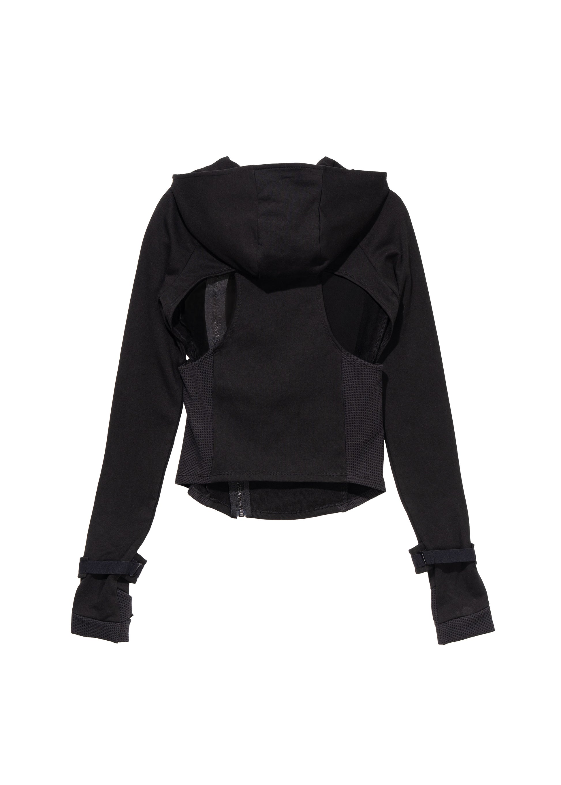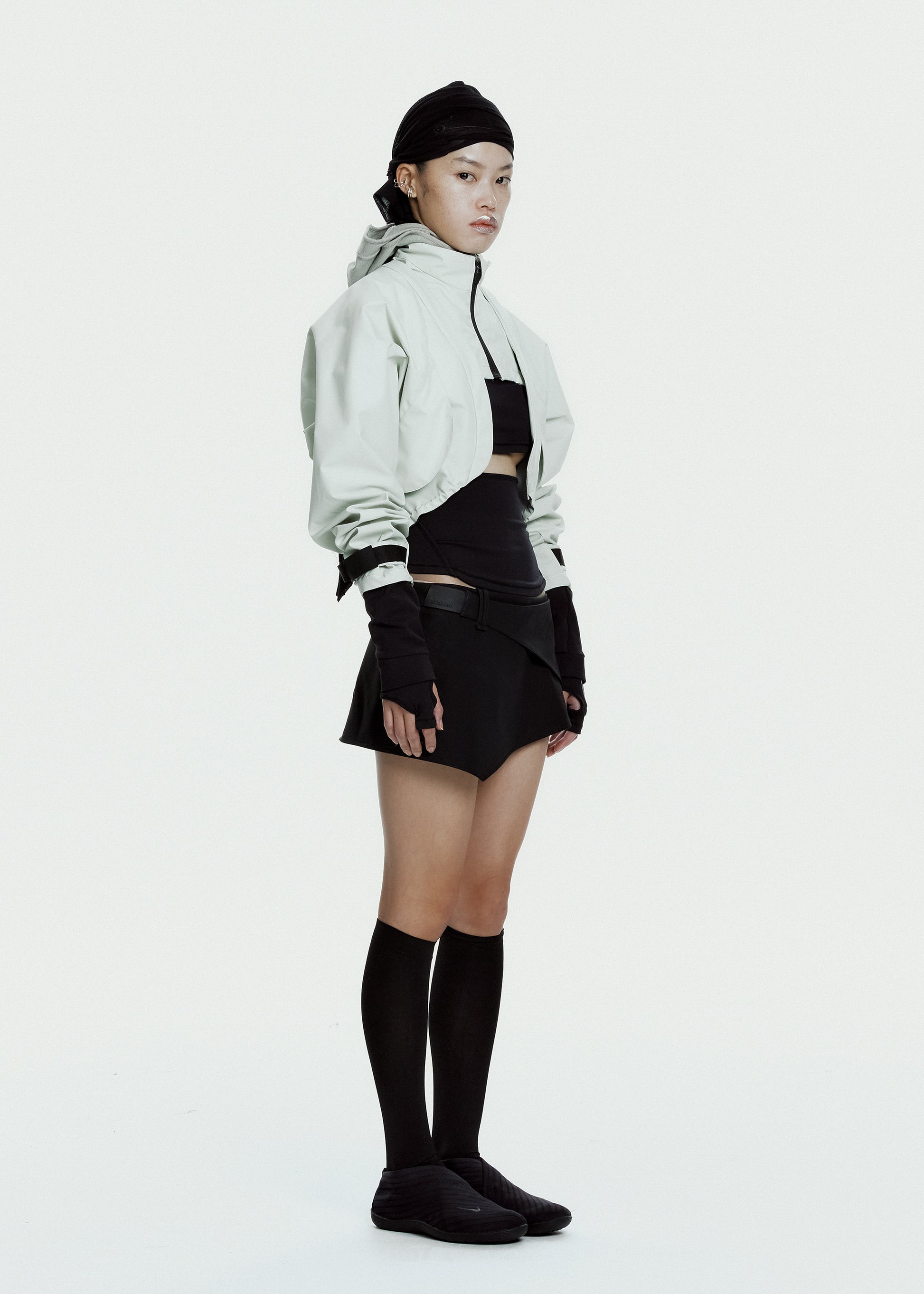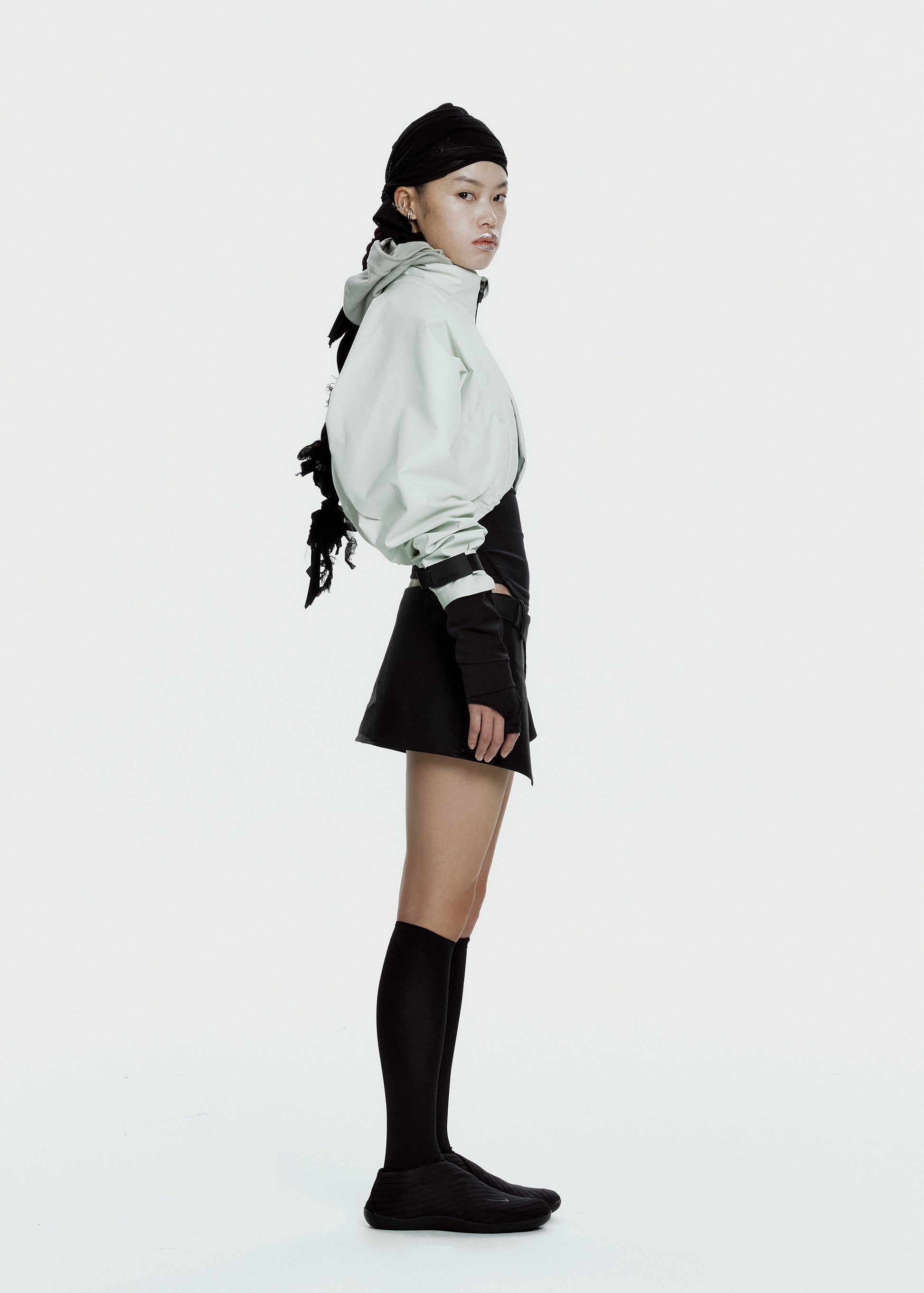 Adjustable wrap mini skirt with snaps, laser cut-punching detail throughout.