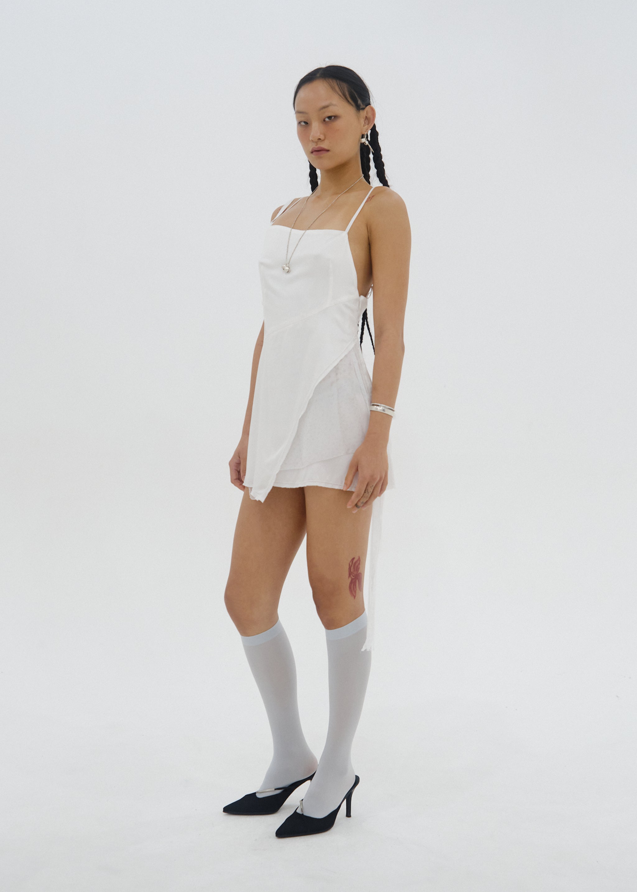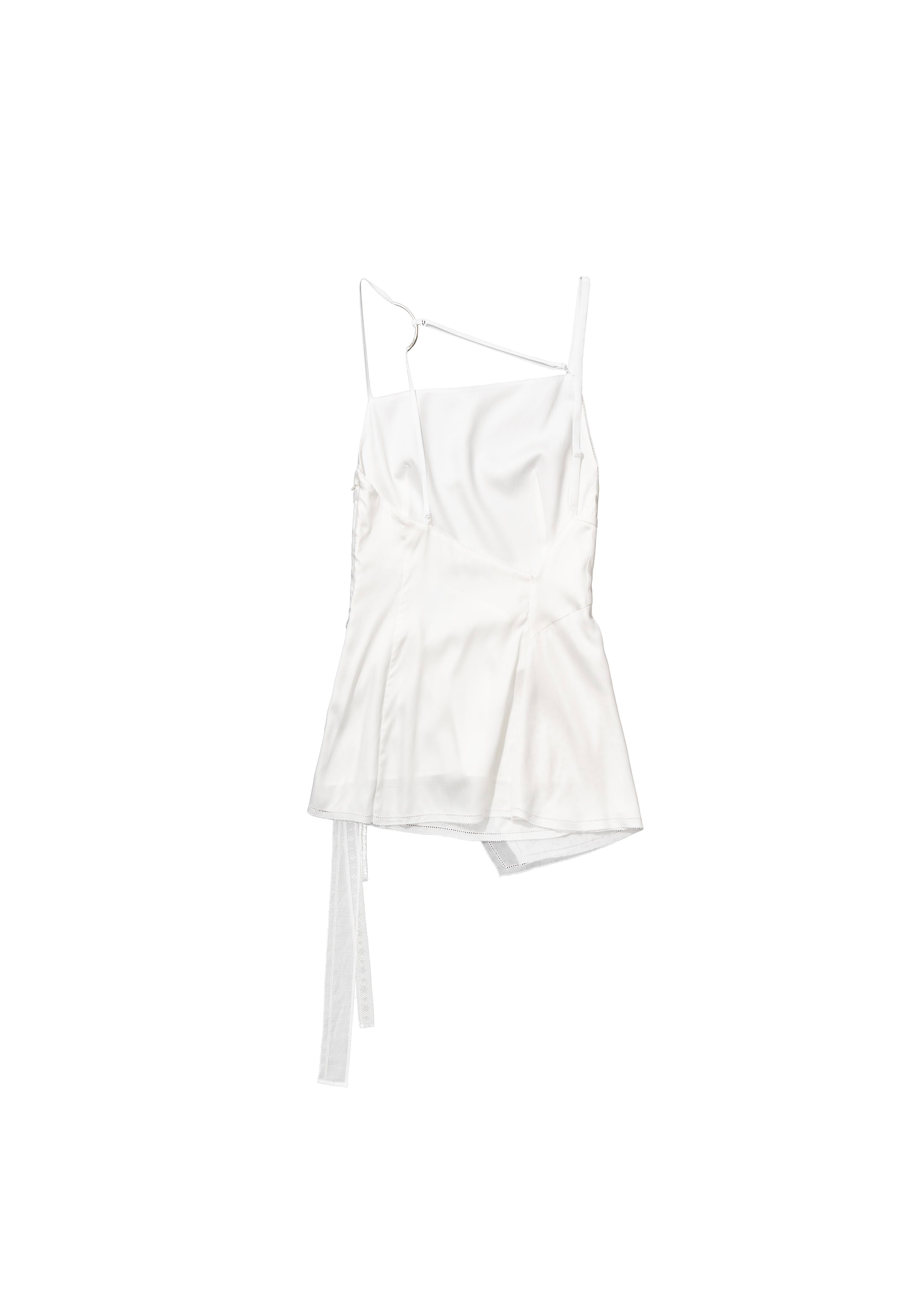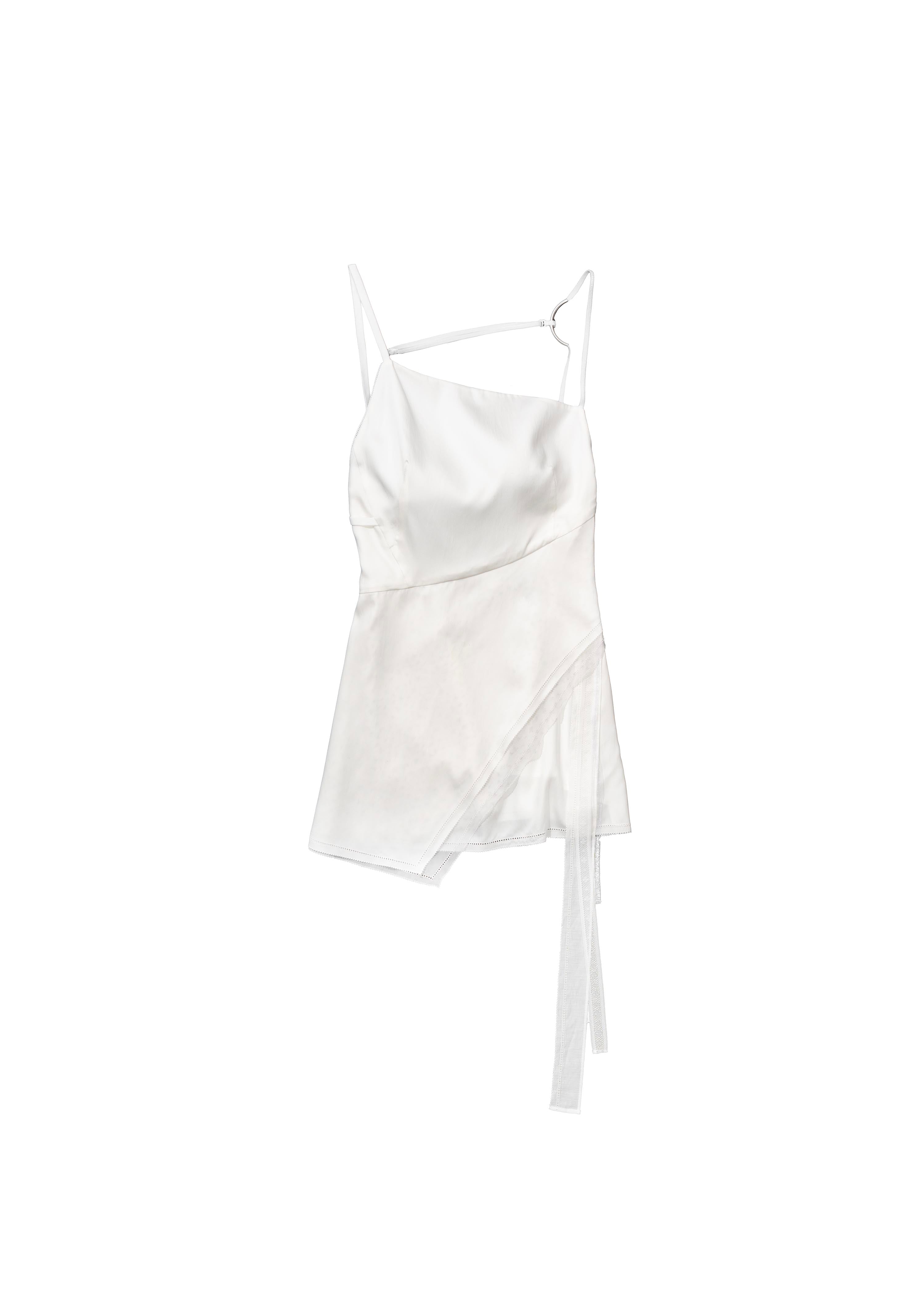 Satin mini dress featuring asymmetrical shoulder straps connected by logo-engraved brass hardware at the back. The skirt showcases layered printed fabric with lace trimming. A side seam zipper provides ease of wear.