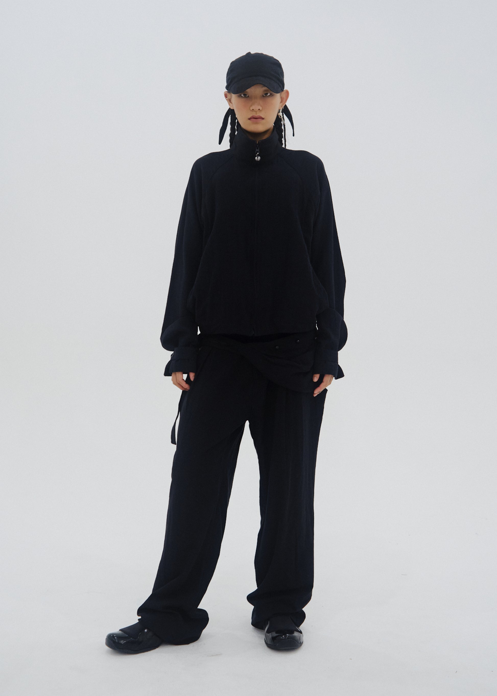 Cotton blouson featuring a seed-shaped bell charm detail on the front zip puller. The front opening of the jacket can be closed using the buttons on the inner placket. The jacket is adjustable at the sides and cuffs with buttons for a customized fit.