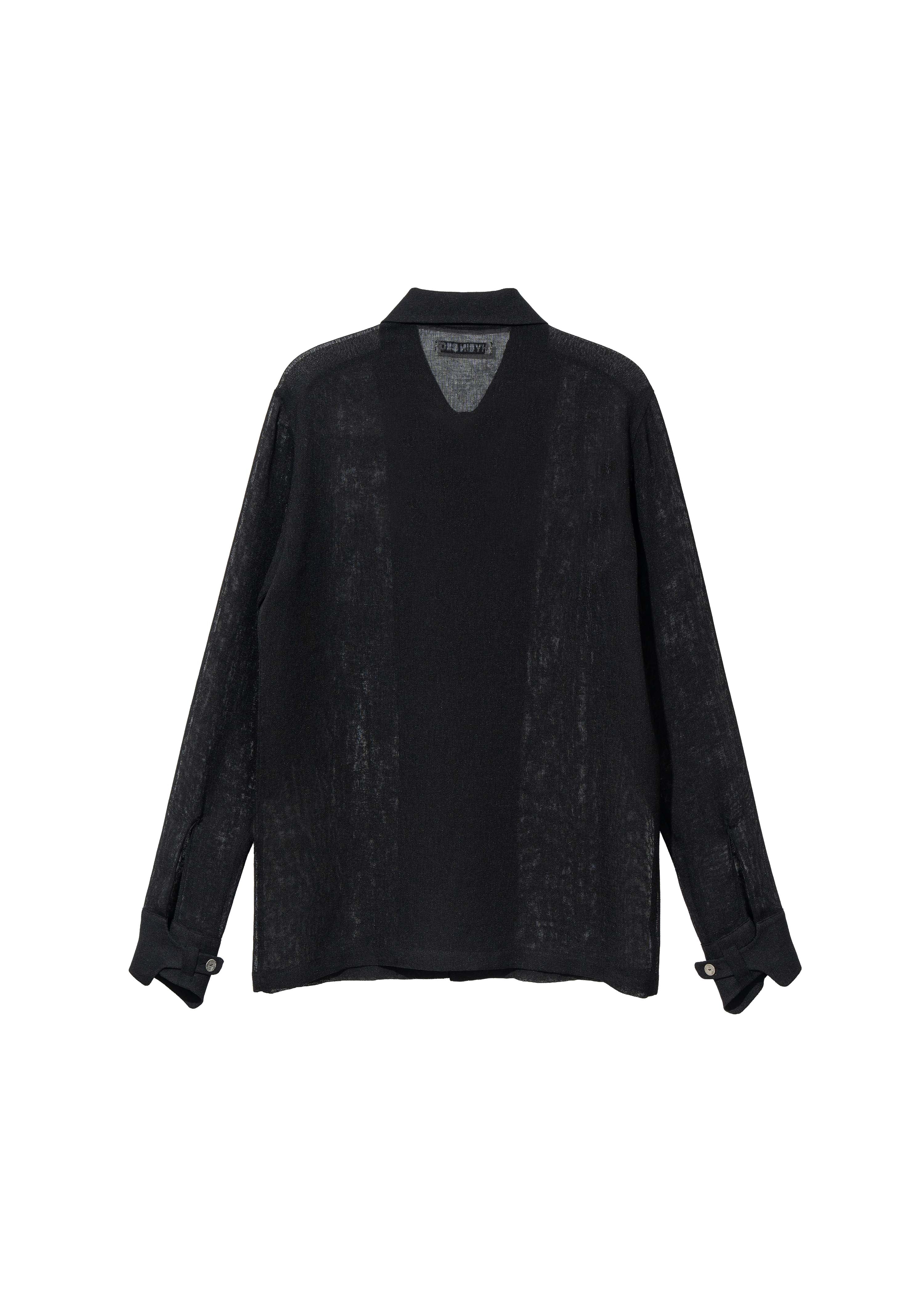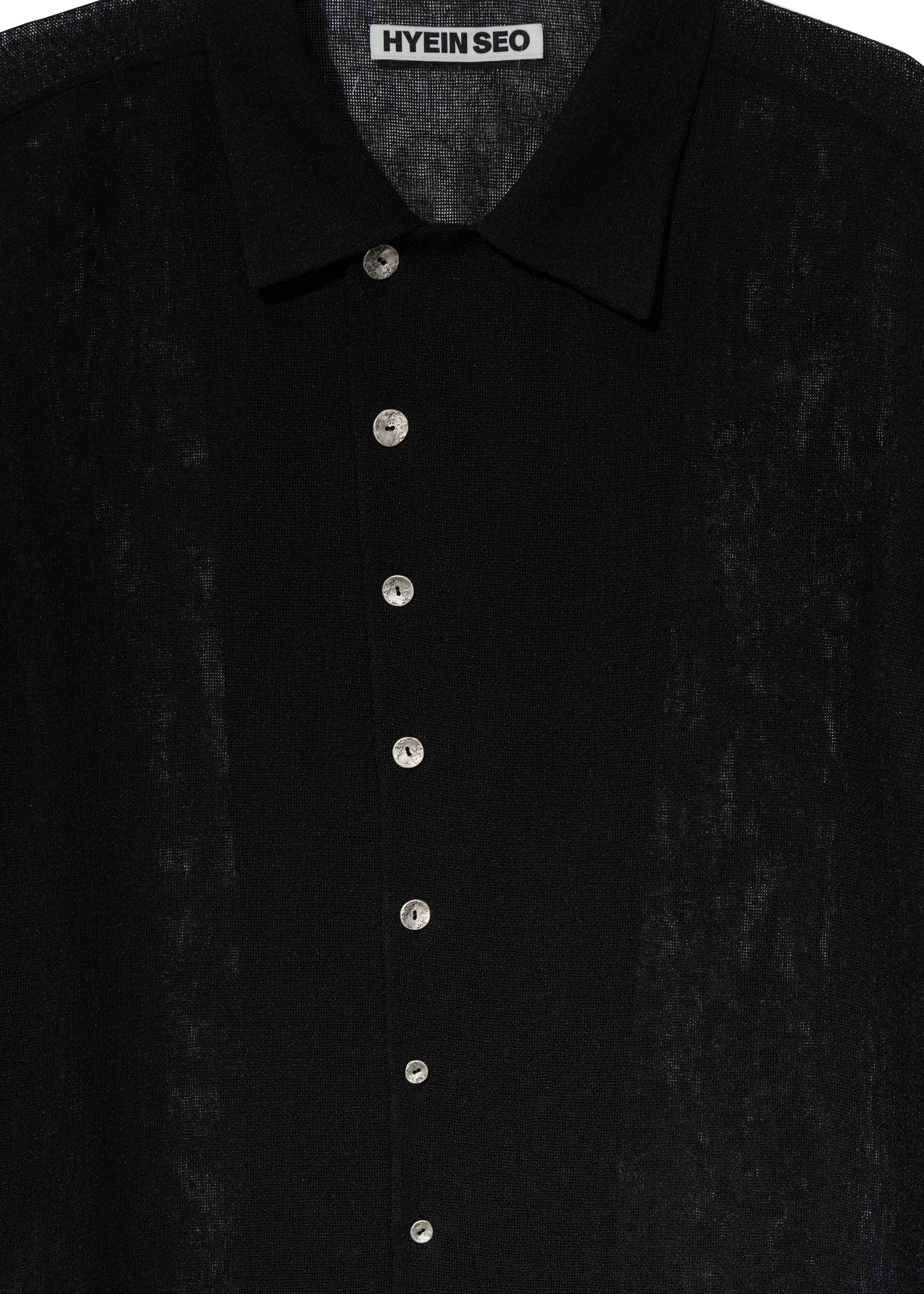 Collared shirt in textured fabric with a hemp-like feel. Features crinkled buttons in assorted sizes at the front and button closures at the cuffs.