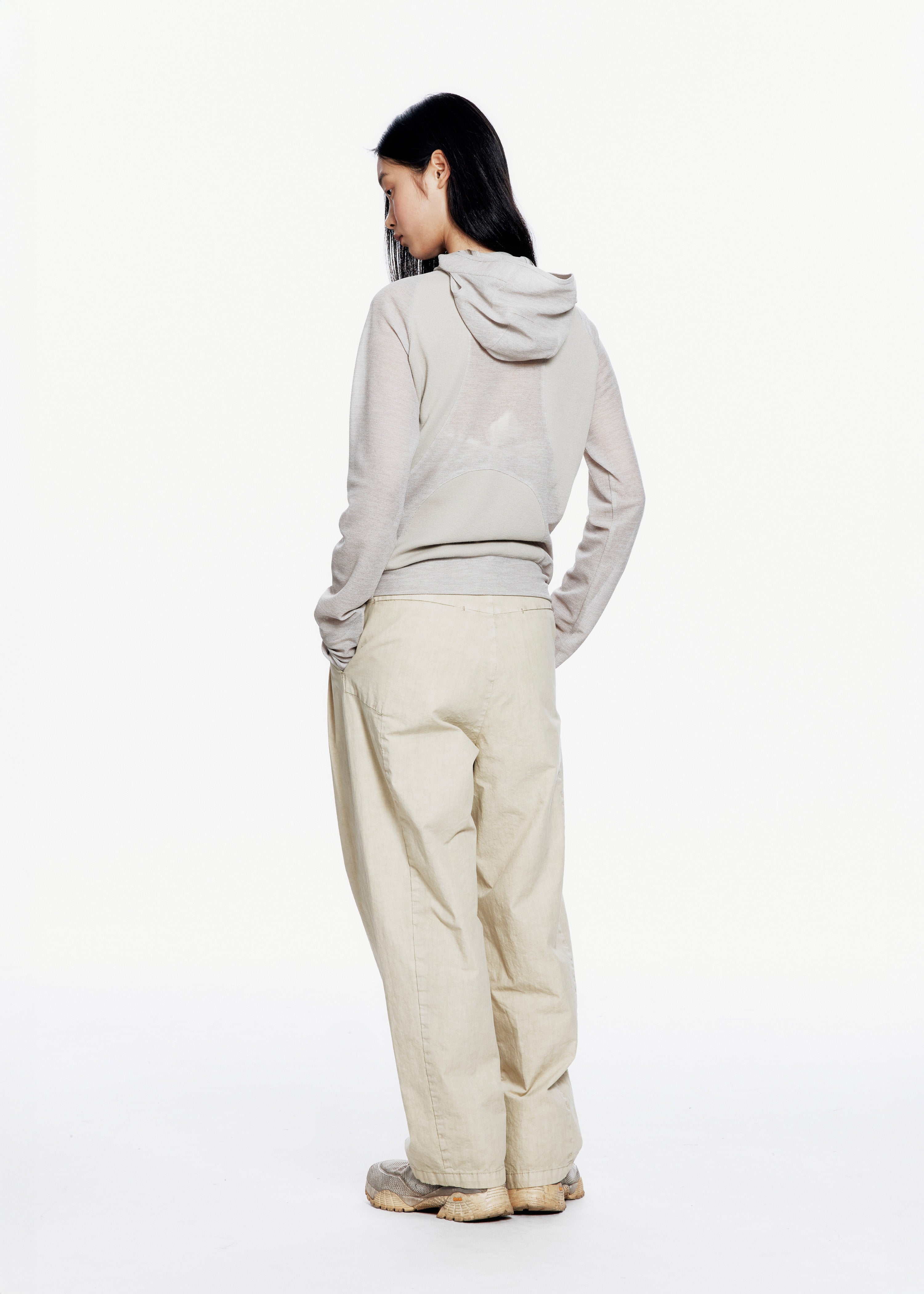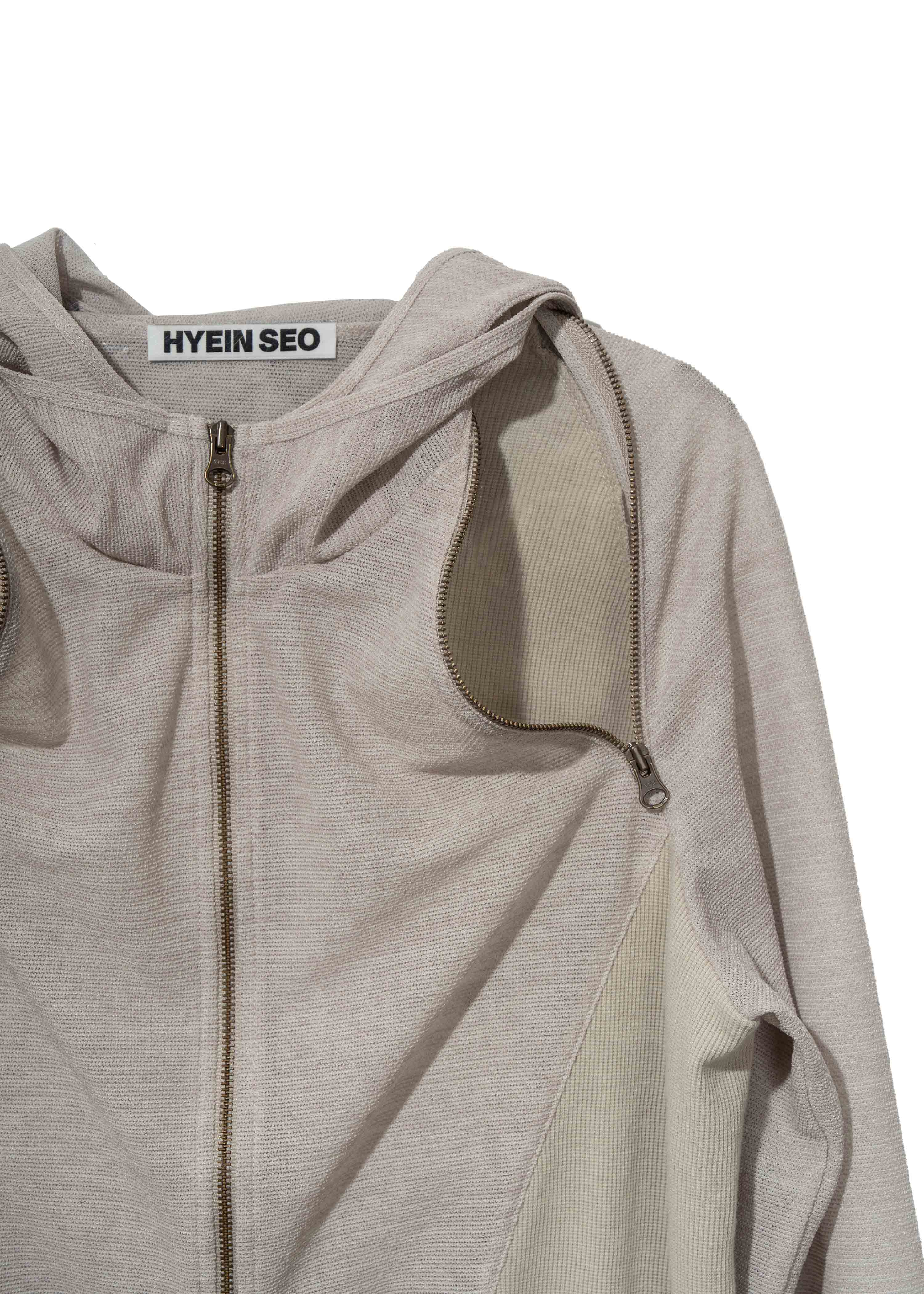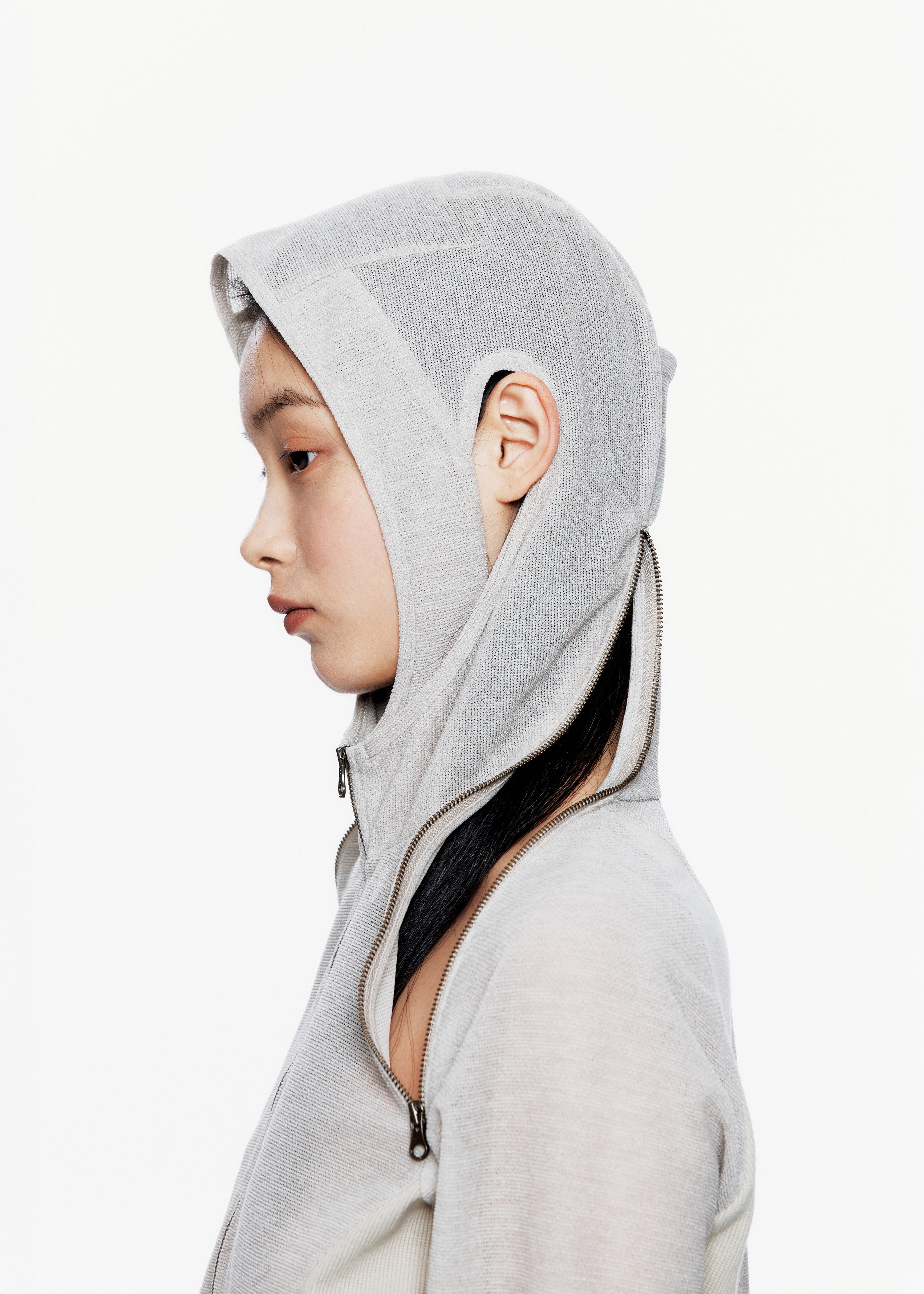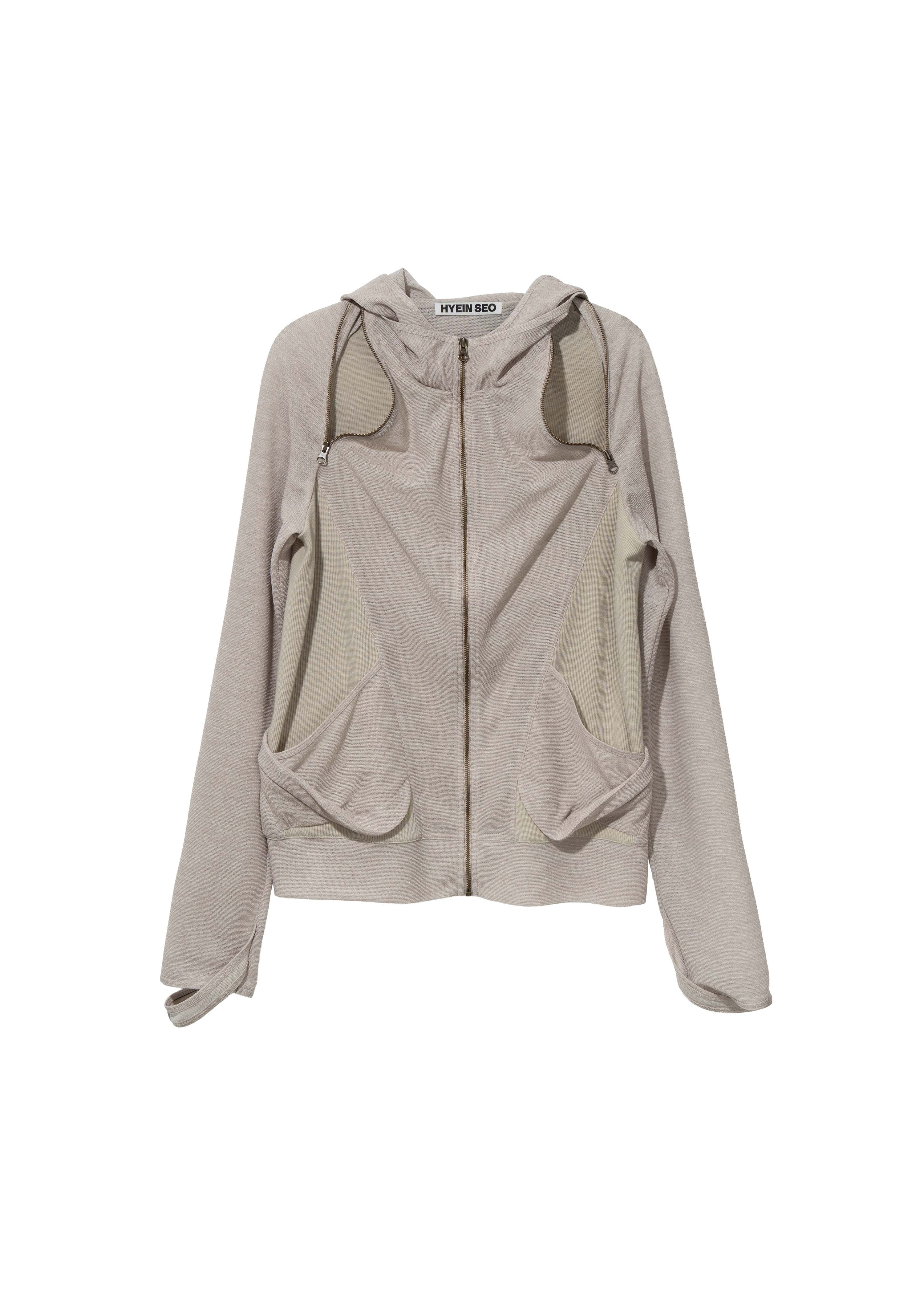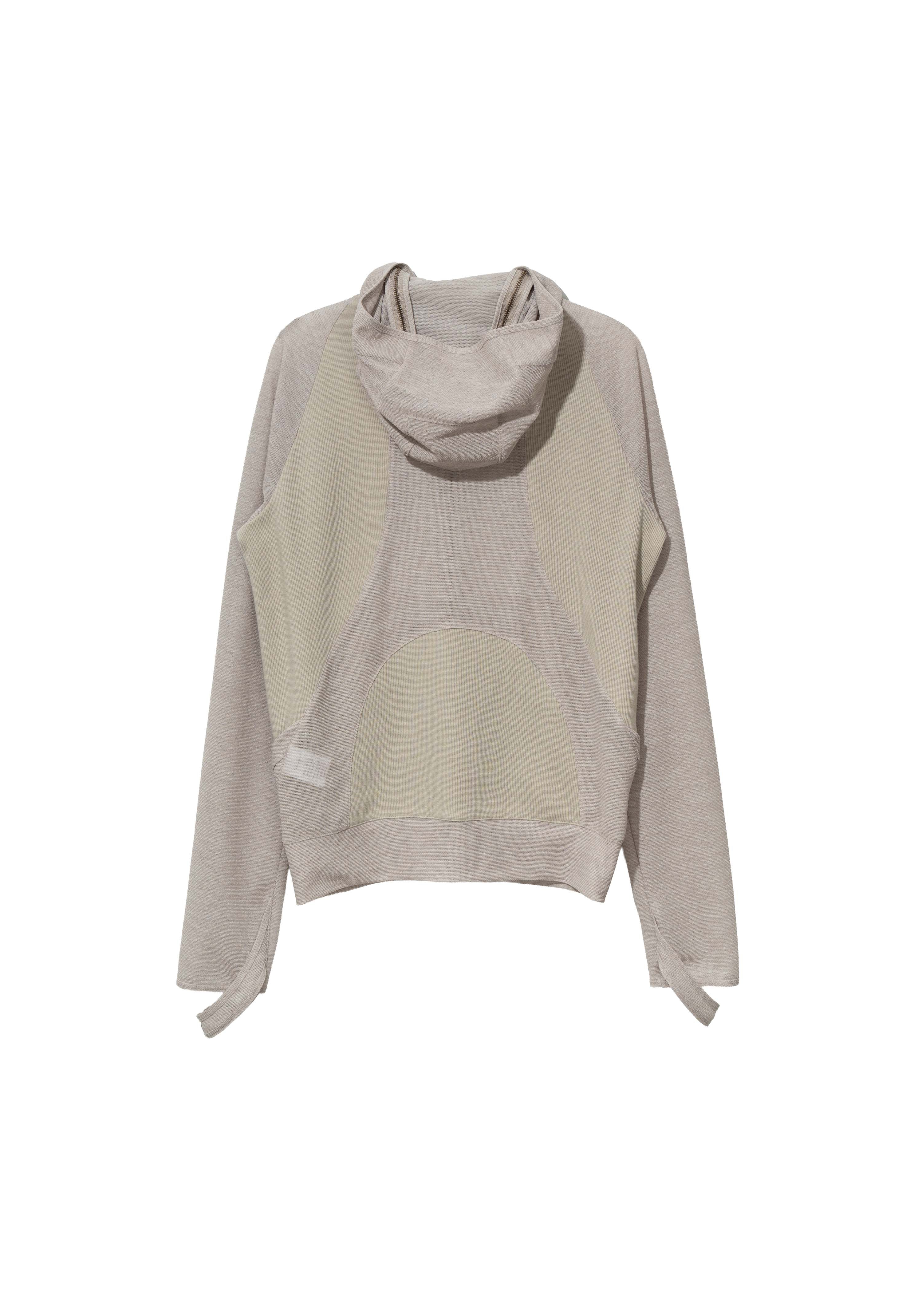 Zip hoodie with functional zippers extending from underarm to side neck. Contrasting fabric panels enhance structure. Features thumbholes at the sleeves, ear cutout detail, and a ponytail hole at the back of the hood.