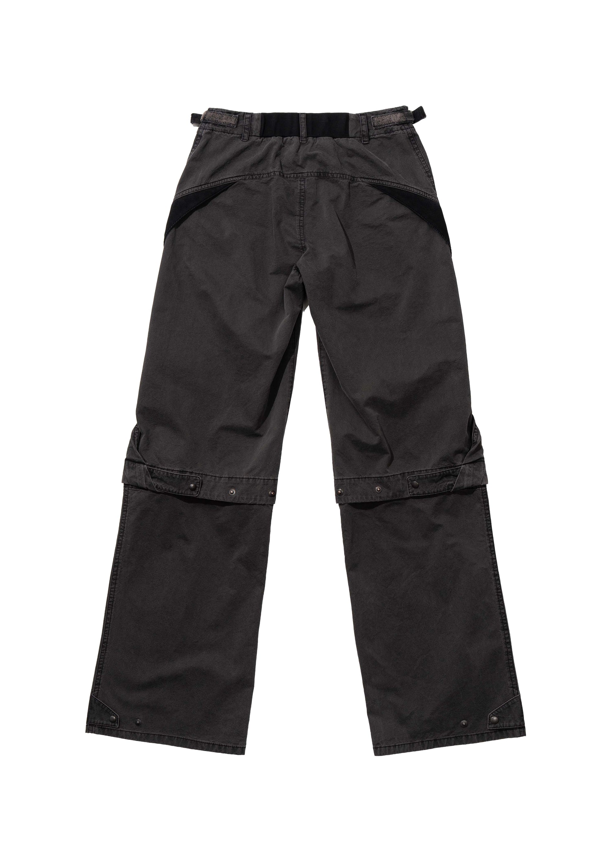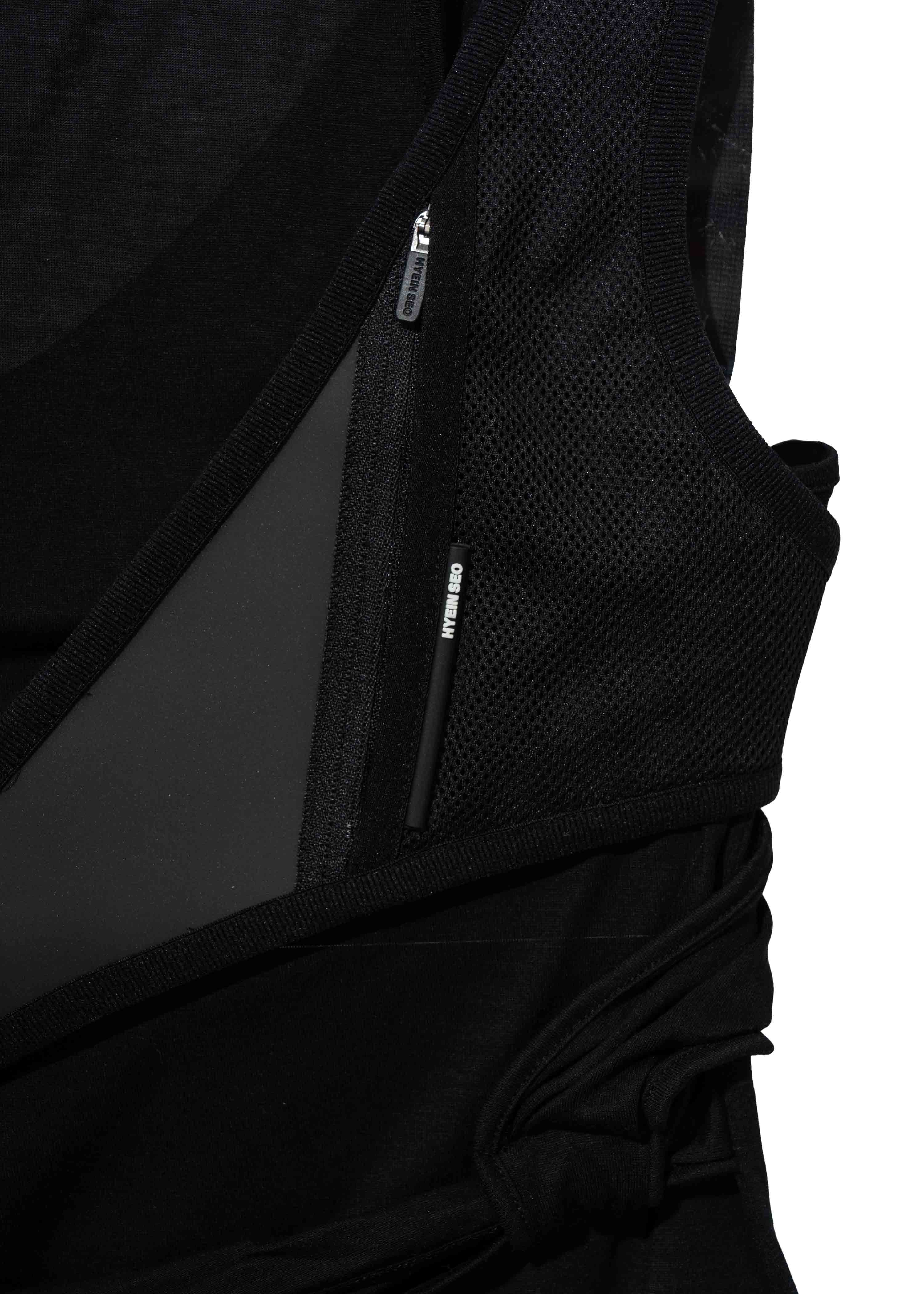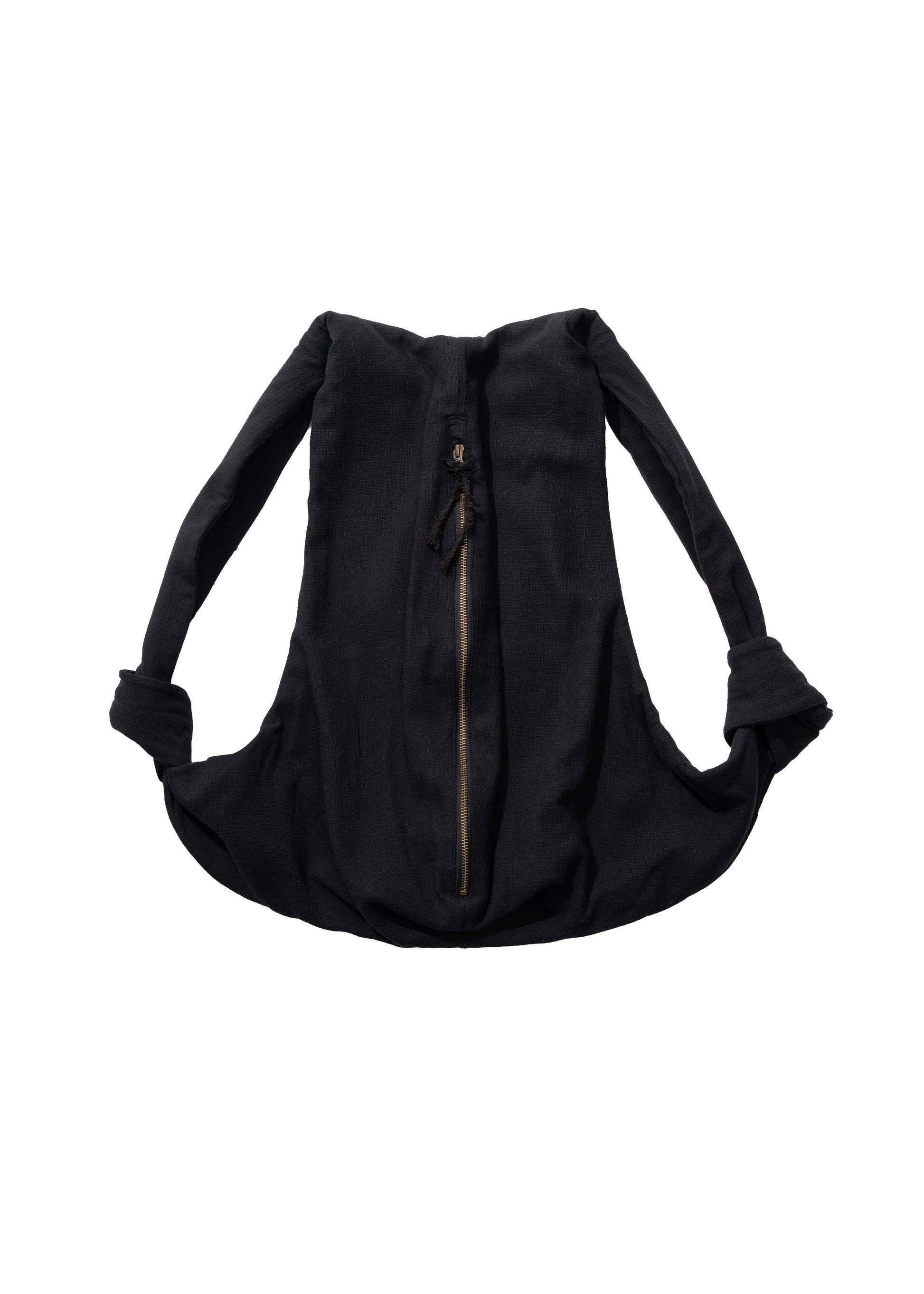 Top with layered panels passing through a cylindrical rubber element, wrapping around the neck and shoulders and tying like a shoulder strap. Shirring detail along neck and shoulders. Back panel features a cutout. Comes with a detachable backstrap featuring one shoulder strap, one waist strap, and a zippered pocket.