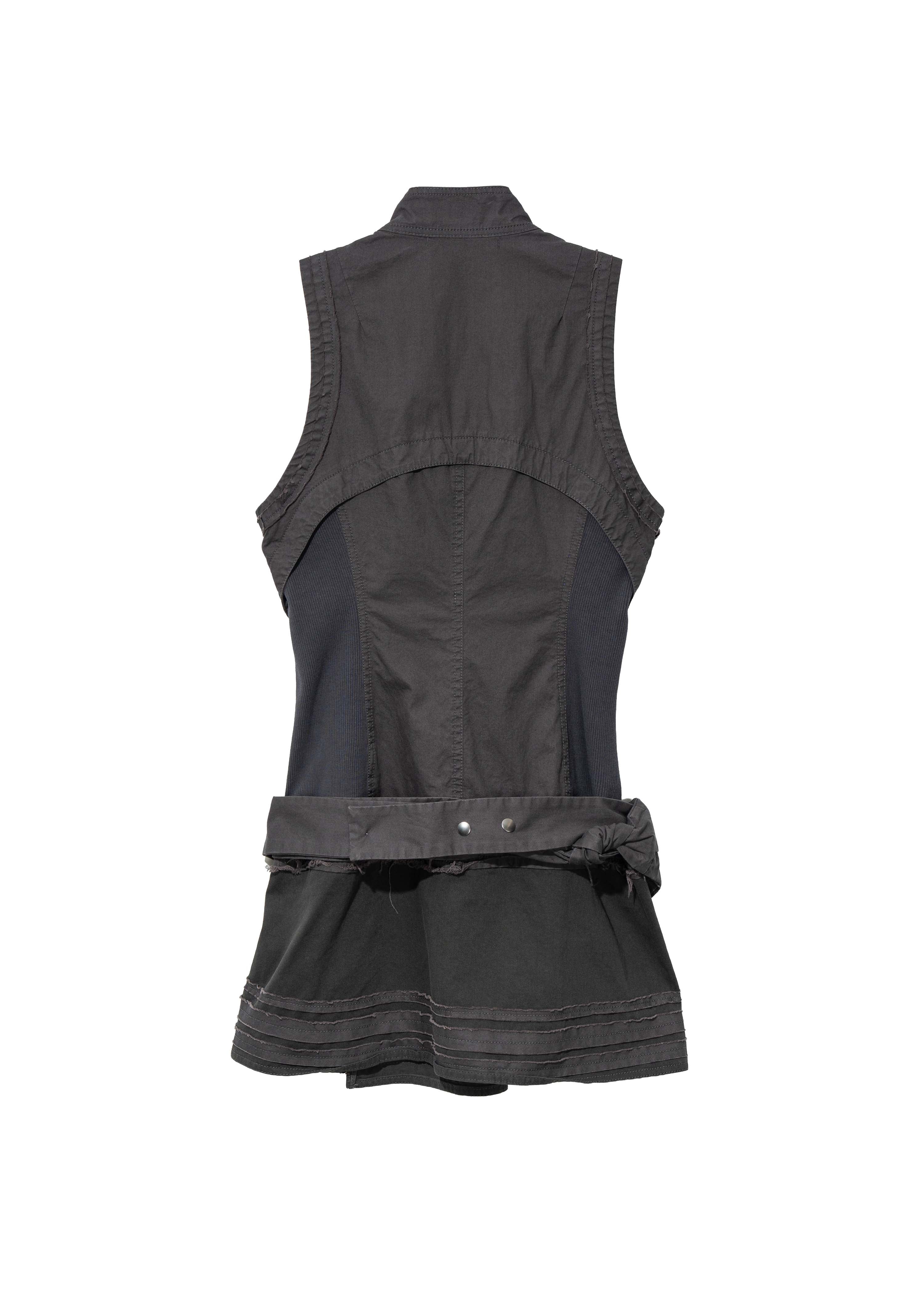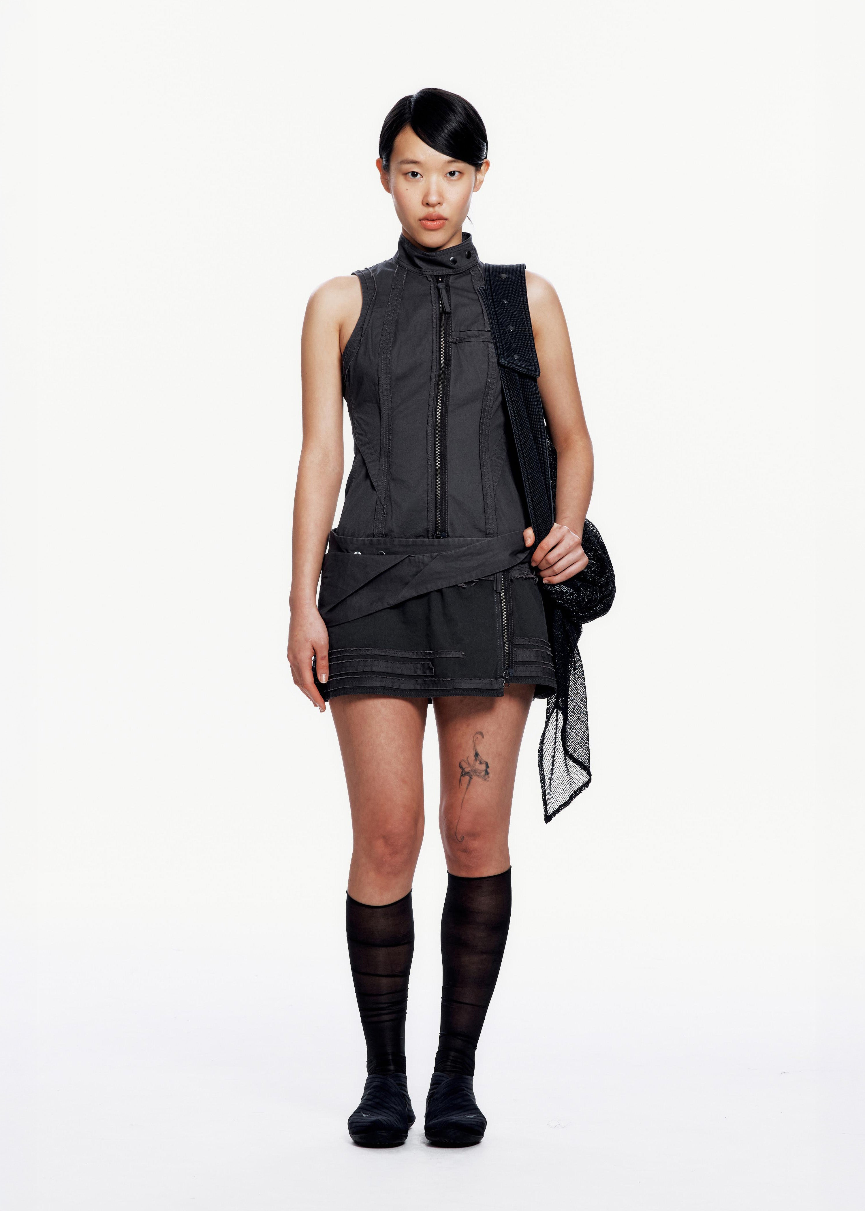 Sleeveless dress with a bio-washed finish. Features a stand collar with snap button closure and raw edge details along seams and skirt. Each zipper is finished with a self-fabric pull tab. Comes with a detachable belt bag that can be worn around the waist or separately.