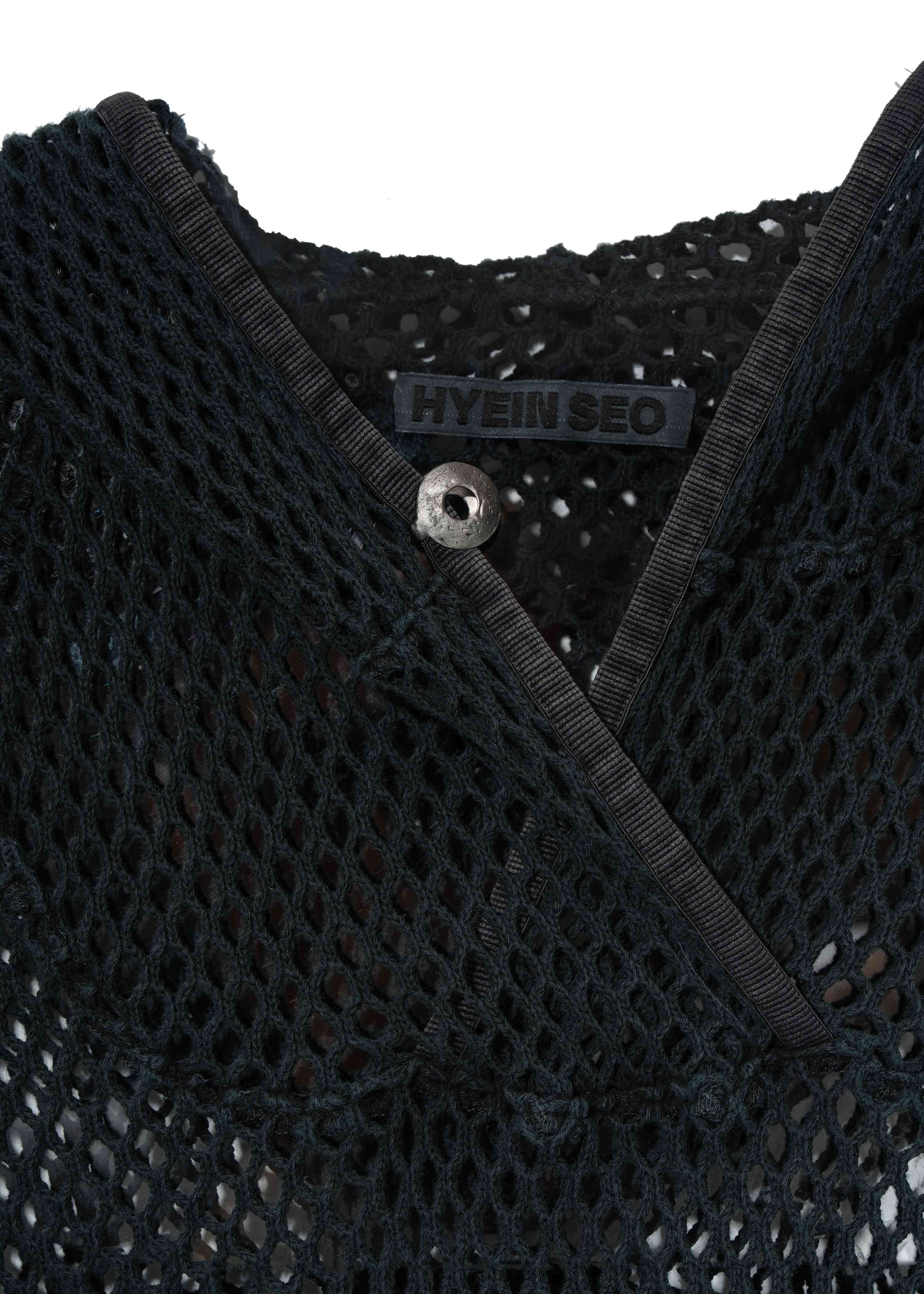 Mesh hoodie with a washed finish. Secured at the neck with a brass circular hook. Features thumbholes at the sleeves and a front kangaroo pocket.