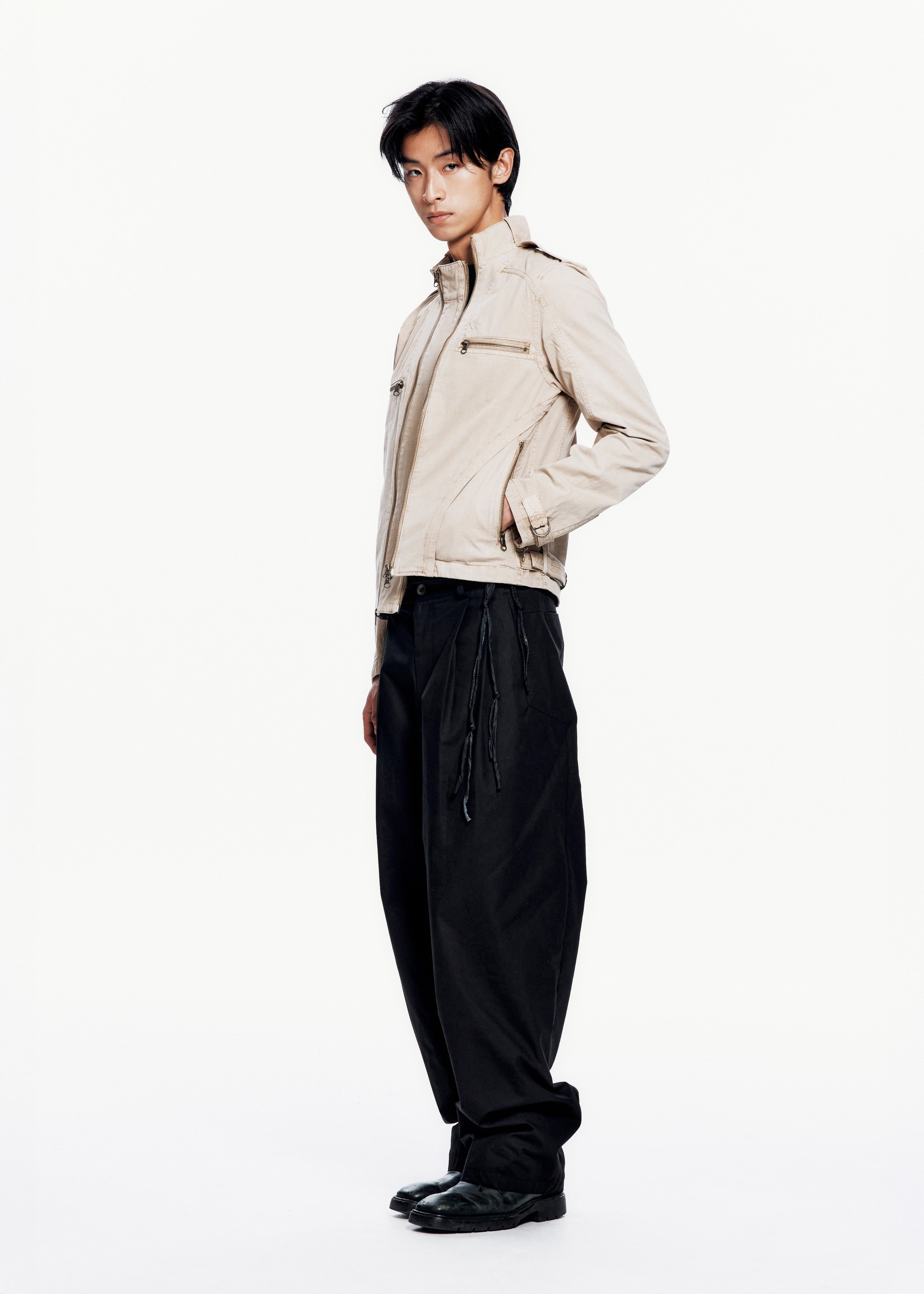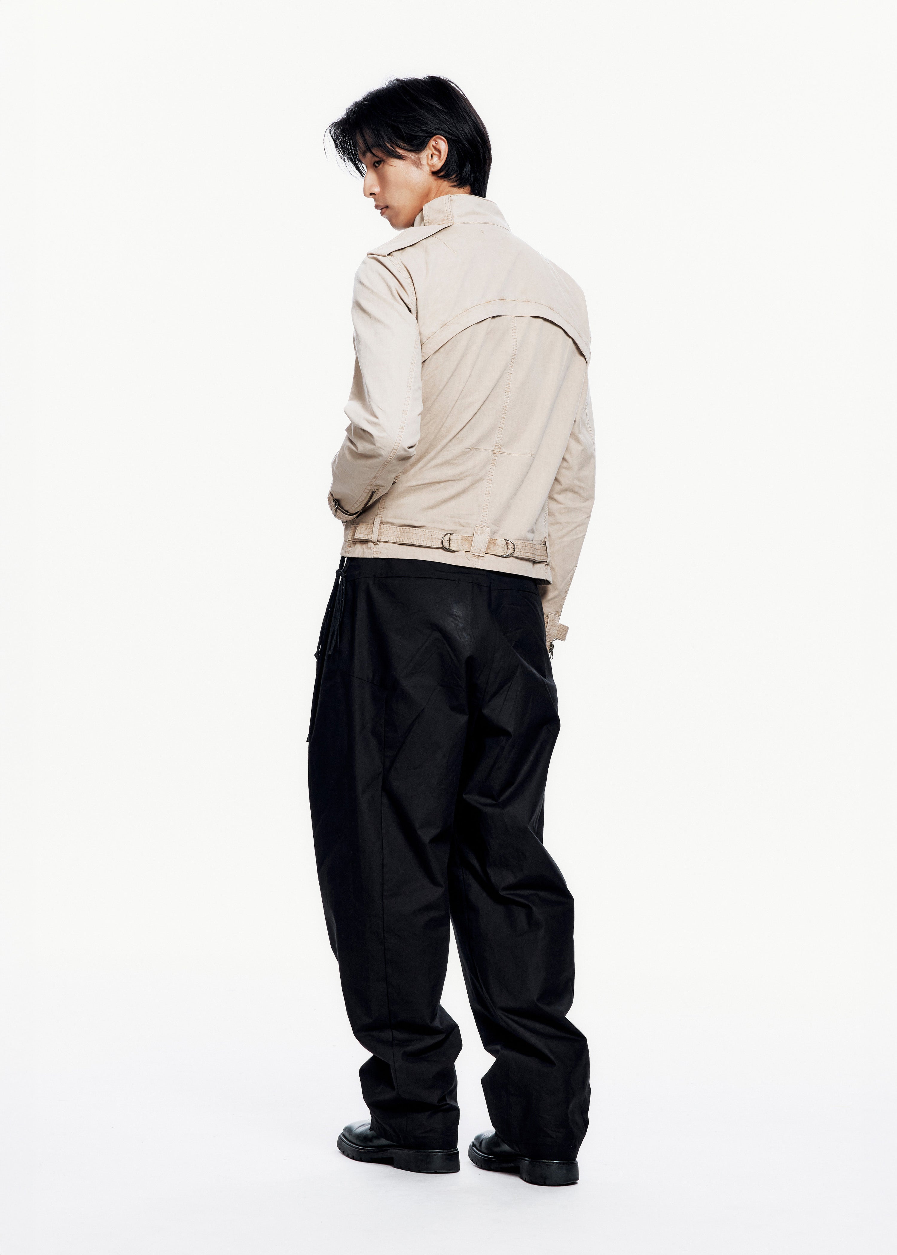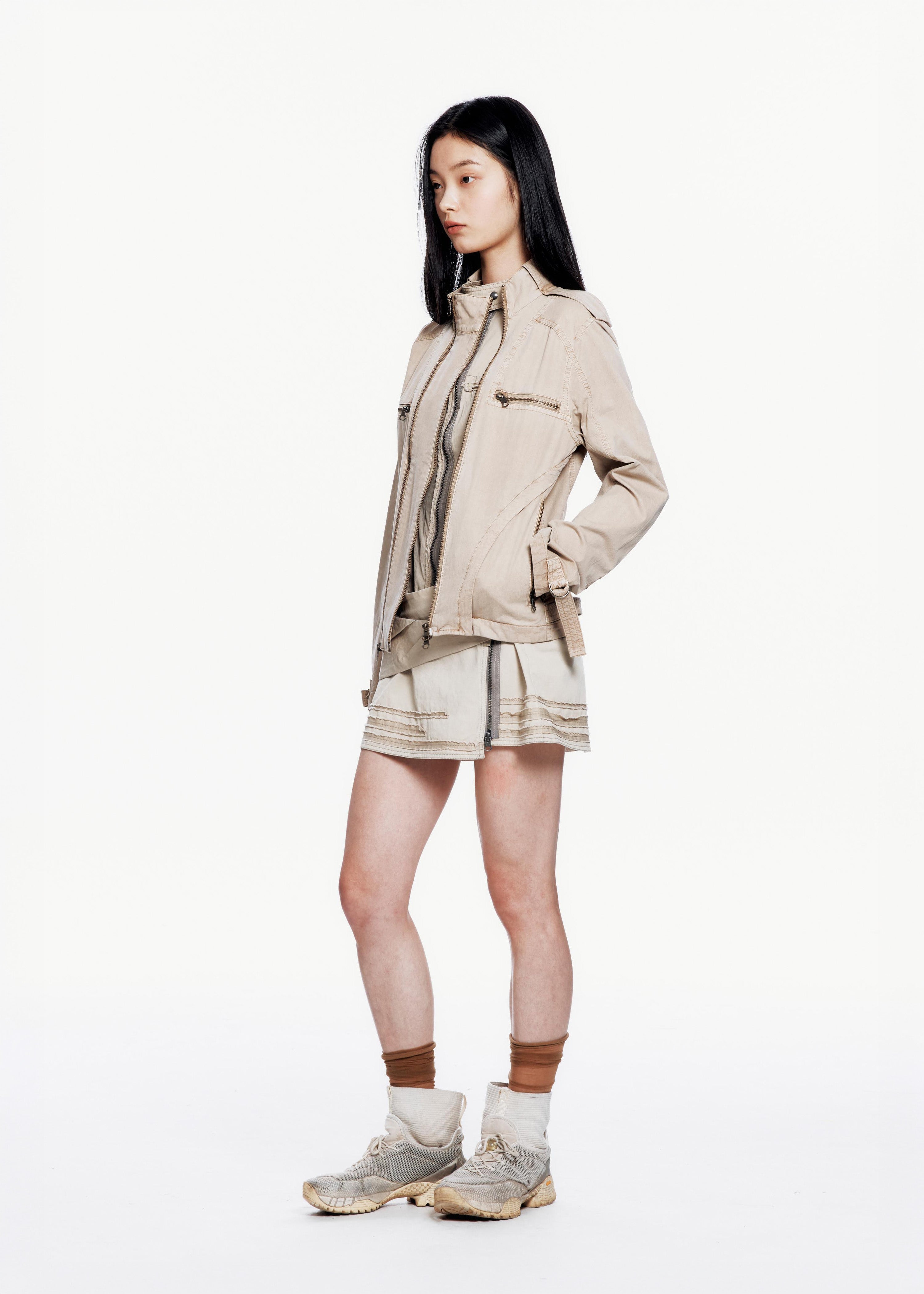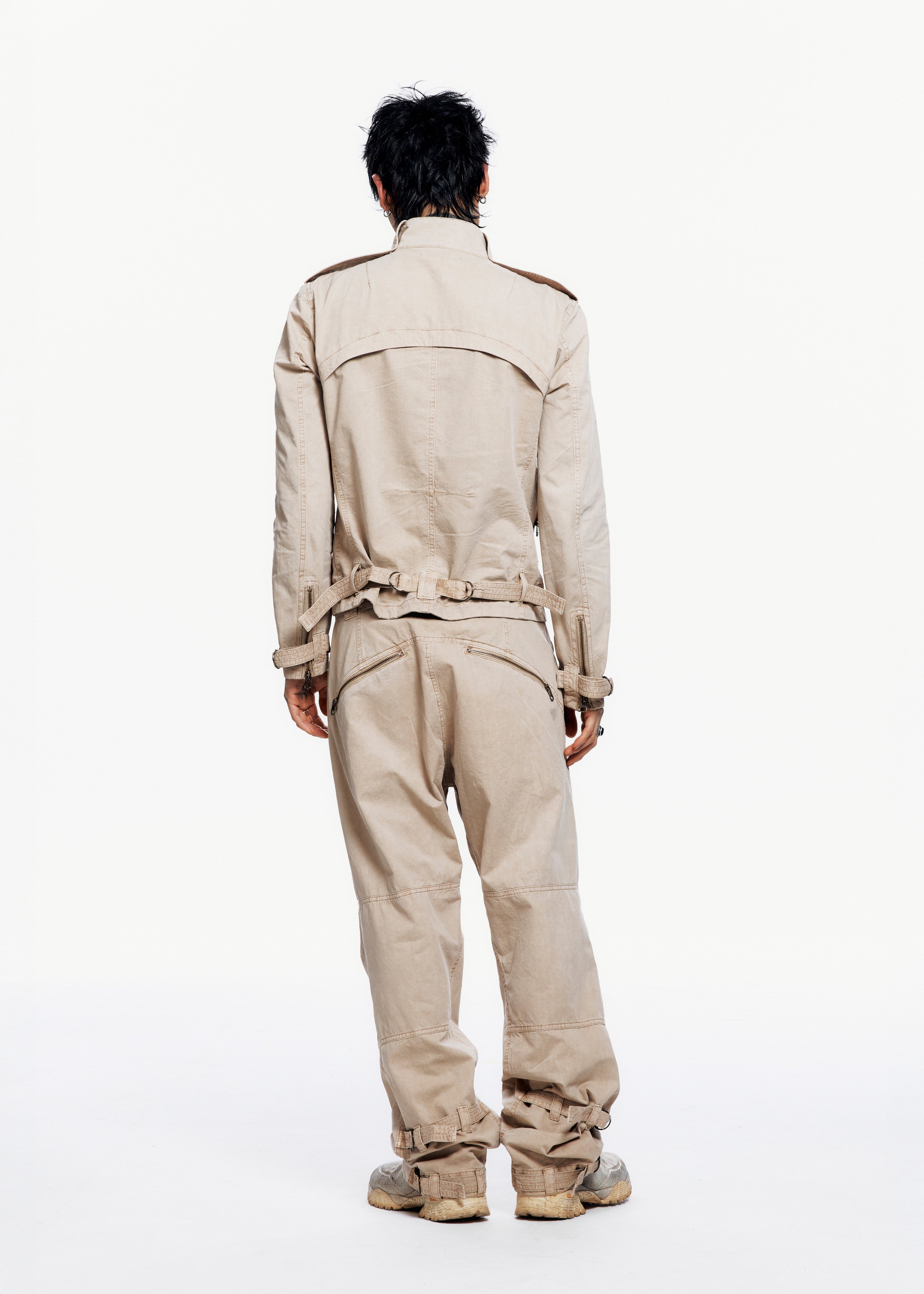 Pigment-dyed jacket with natural creased texture. Features epaulets at the shoulders, two two-way zippers at the front, two chest pockets, two side pockets, and adjustable straps at the cuffs.