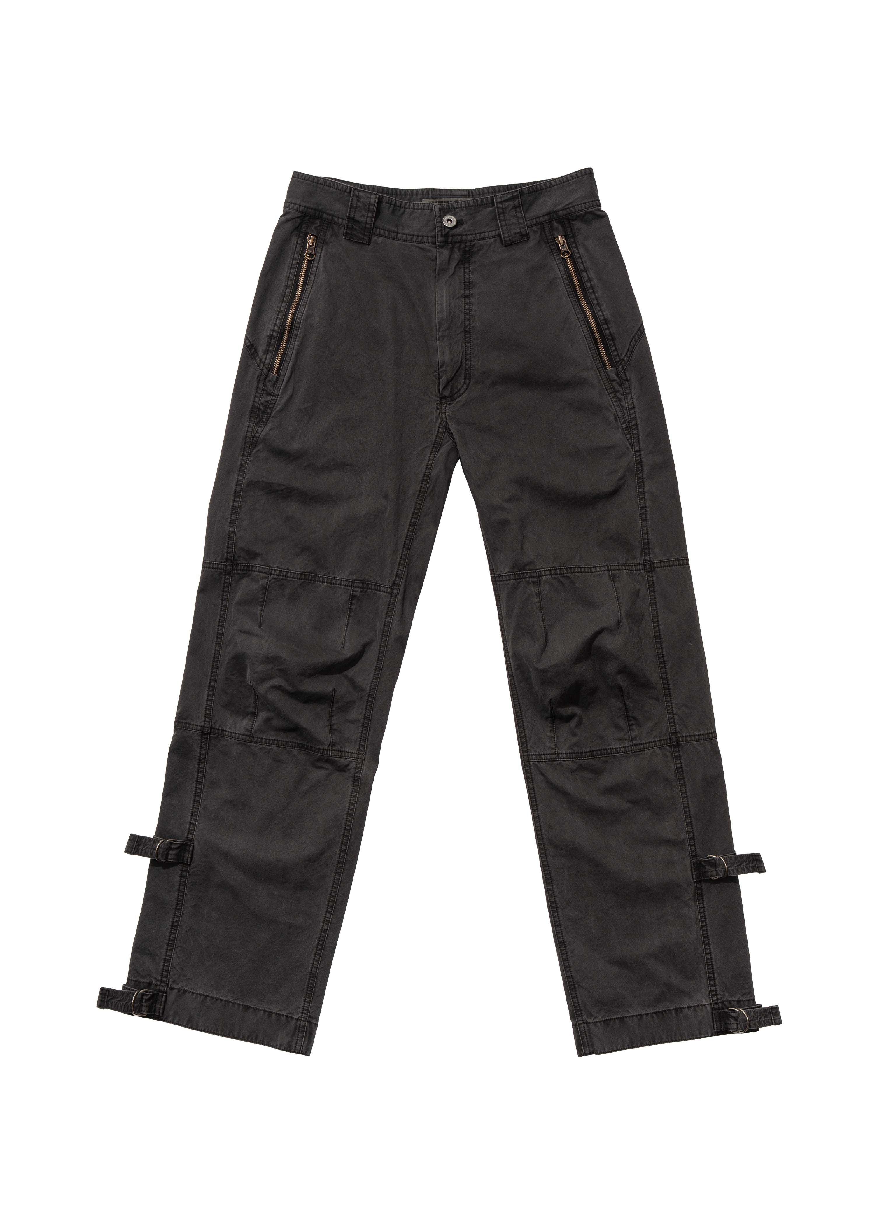 Pigment-dyed pants with zippered front side pockets. Features two belt fasteners on each leg—one at the hem and one at quarter length—for adjustable tapering.